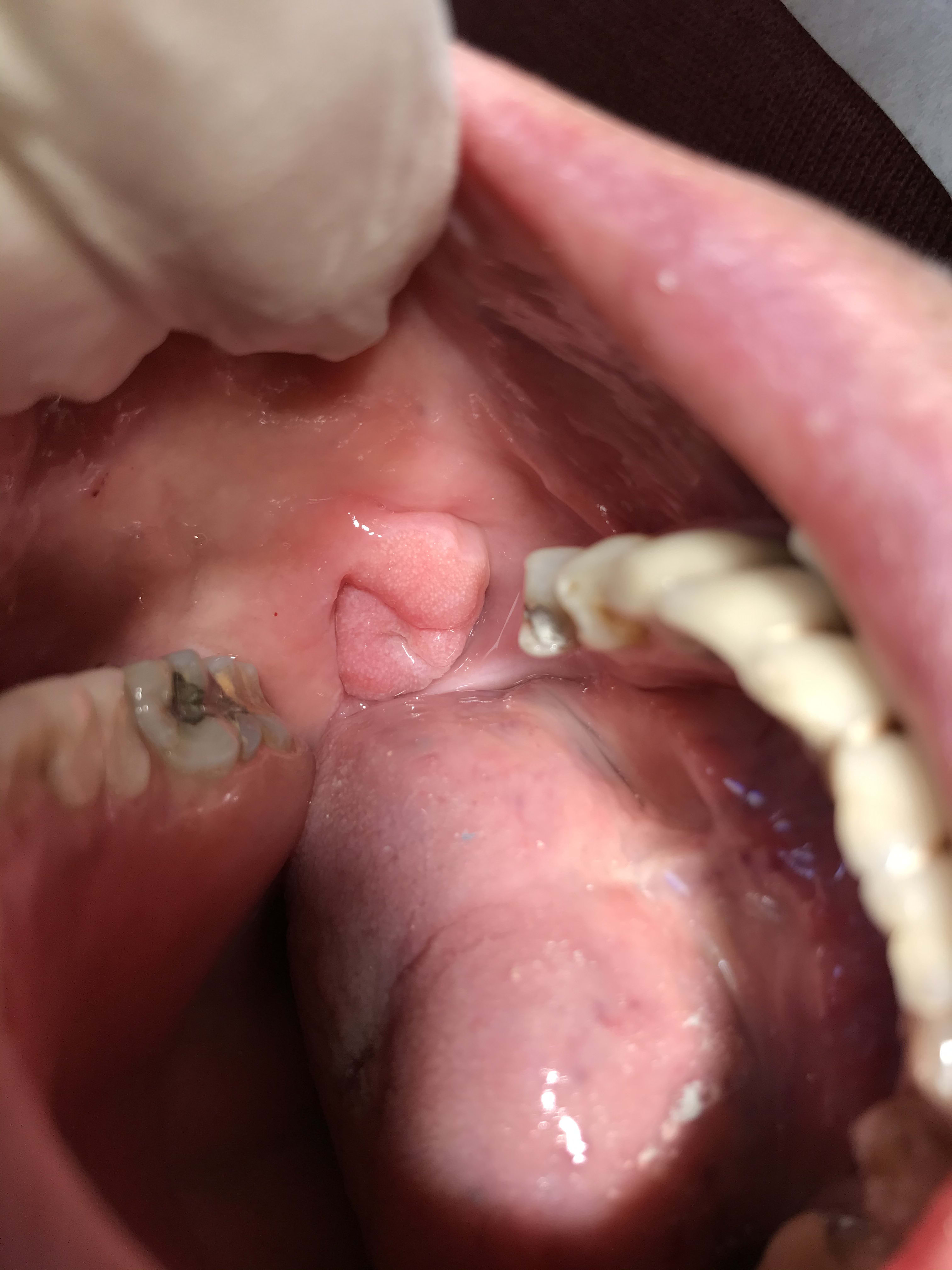 Regarde moi ça Vulpi , celui-ci je lui ai mis 7 implants qui sont en train de prendre au maxillaire, je lui fais un bridge à droite pour l’occlusion. Et à gauche il a une grosse boule semi molle qui est apparue sur la face interne de la joue. Il ne veut pas que je lui case une 36 sur implant ...