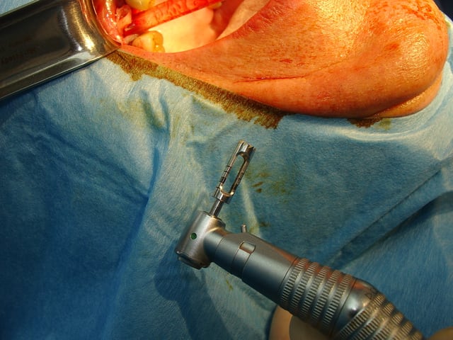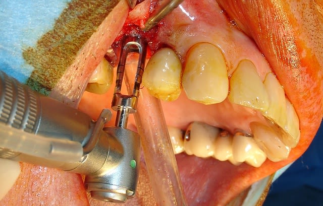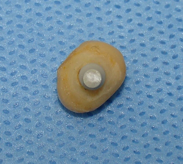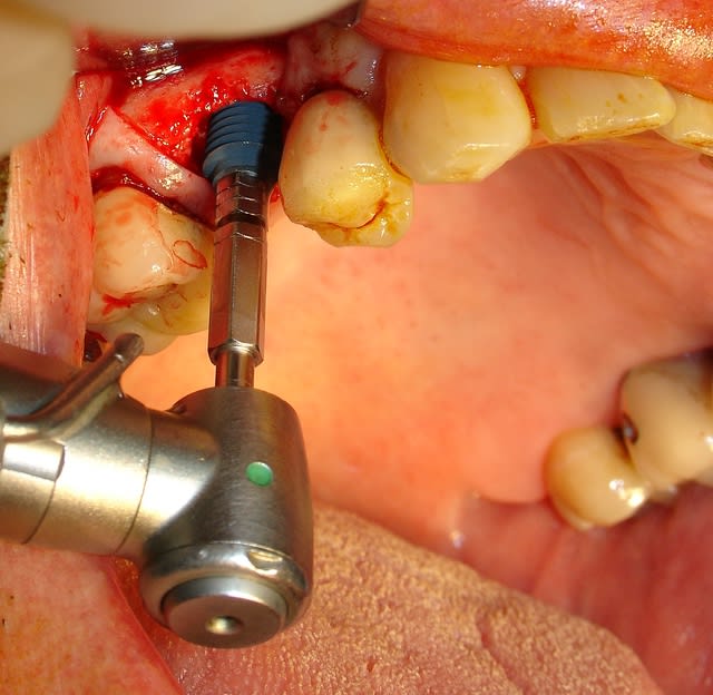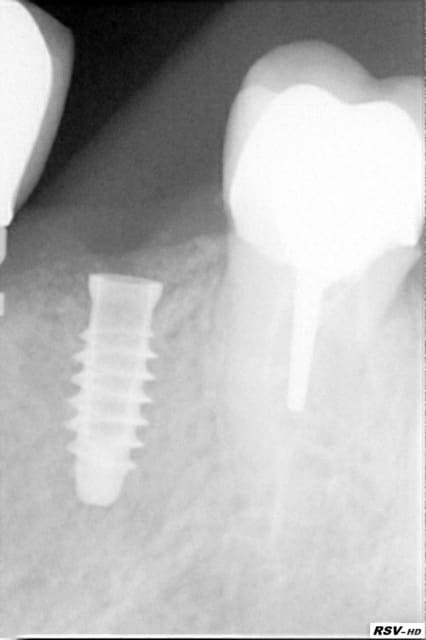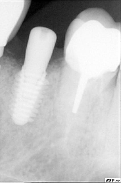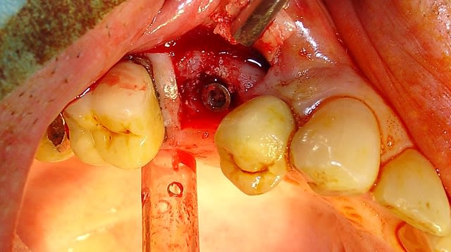 Après des tentatives infructueuses de retirer la partie "soudée" dans l'implant la décision fut prise de remplacer cet implant. Il est parfaitement ostéointégré et dans ce cas ceux qui en ont posé savent qu'il impossible de le dévisser sans fracture osseuse même lors de son placement.