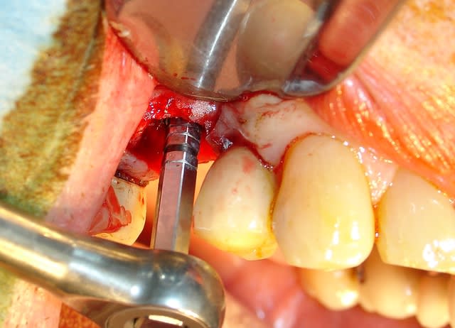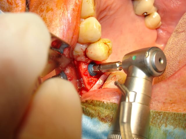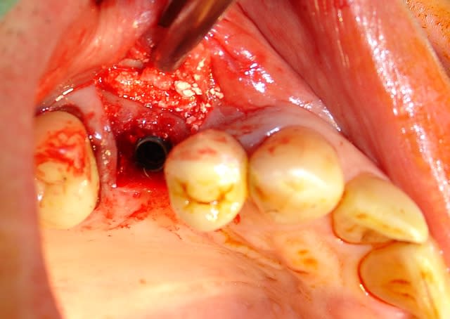 Le remplacement c'est fait par un AnyRidge de chez MegaGen de diamètre 5 et longueur 10. J'ai juste profiter de la situation pour re-combler là ou en 2007 on avait mis de l'os autogène....mais ou est il passé? Le comblement a été fait avec une recette maison à base de PRF os bovin et bétaTCP.