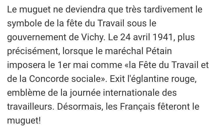 Regardez voir notre grosse Méluche qui s’affiche avec du muguet sur sa veste. Il a l’air tout content :). Il connaît bien l’histoire nous dit on. C’est quelqu’un de cultivé. Sauf que la Méluche reprend l’idée de qui ? Qui a eu la bonne idée d’utiliser le Muguet en premier pour la fête du travail ? C’est le maréchal Pétain. Les cocos et gauchos première catégorie entre 39-45 me semble-t-il n’était pas au gouvernement (sauf le Mitterand qui bouffait déjà à tous les râteliers bien entendu) :))). Notre grosse méluche s’affiche avec son bouquet de muguet et je pense que si il pouvait se le caler là où je pense pour bien passer à la télé, il le ferait. Une petite pensée également pour les communistes qui vendent dans les rues le muguet du maréchal.
