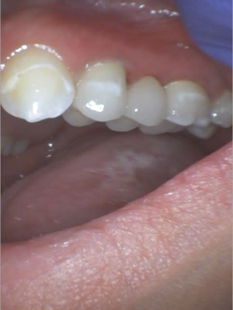 La patiente a opté pour le bridge à cause du remboursement. Mais, les racines de cette jeune patiente étant très très courte, j'ai préféré ne pas prendre le risque d'une nécrose au niveau de la 24 qui aurait pu remettre en cause son maintient sur l'arcade.