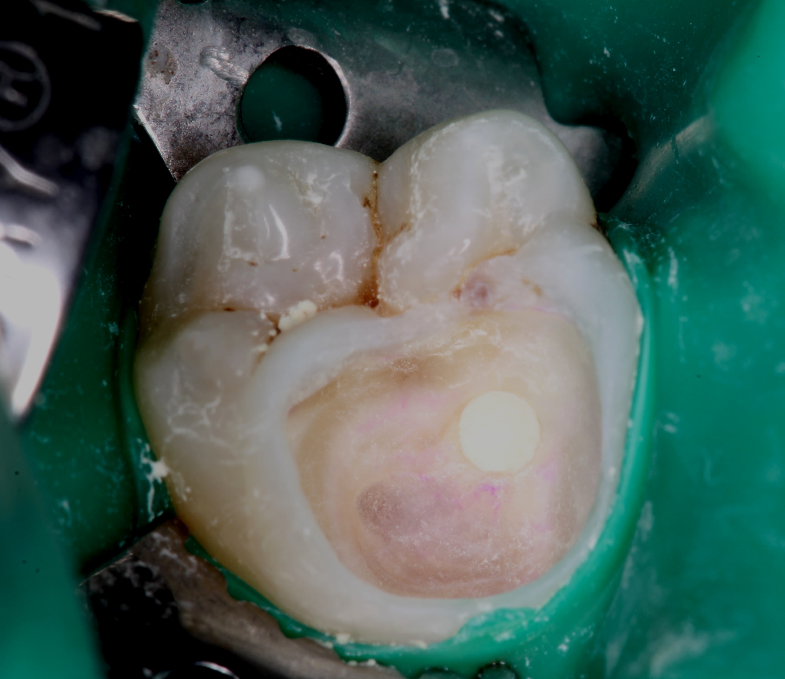 Patient de 18 ans, aucune douleur, test de vitalité normal, carie occluso-vestibulaire.