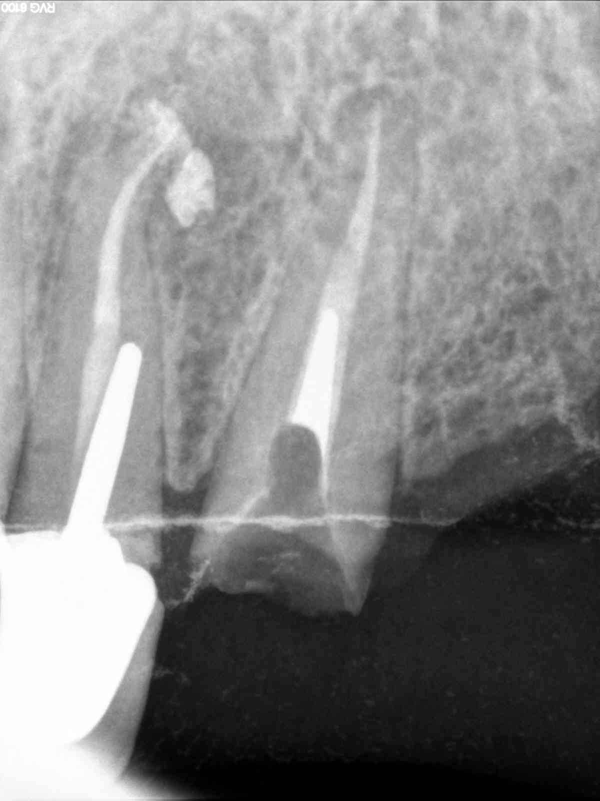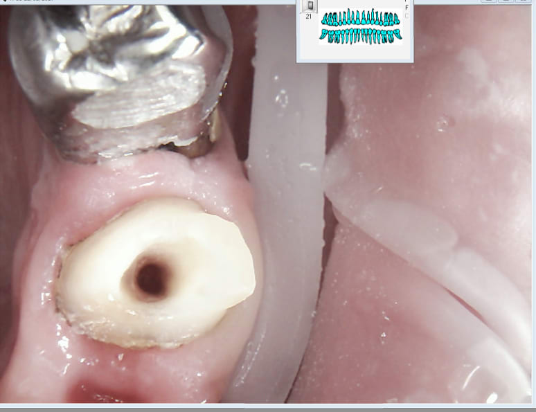 Viens de retourner voir image jointe.... le moignon est me semble-t-il félé, on voit une ligne sombre quart inferieur gauche de l'image qui semble démarrer à peripherie de la preparation et descendre jusque dans la lumière canalaire...