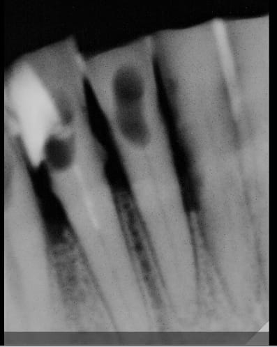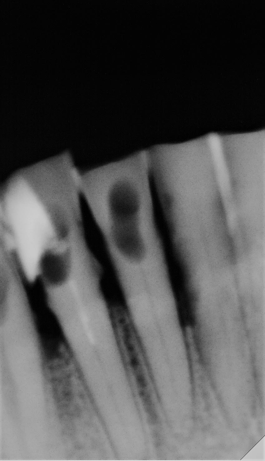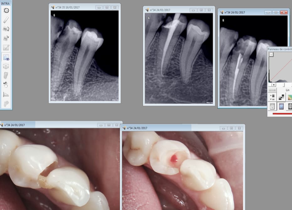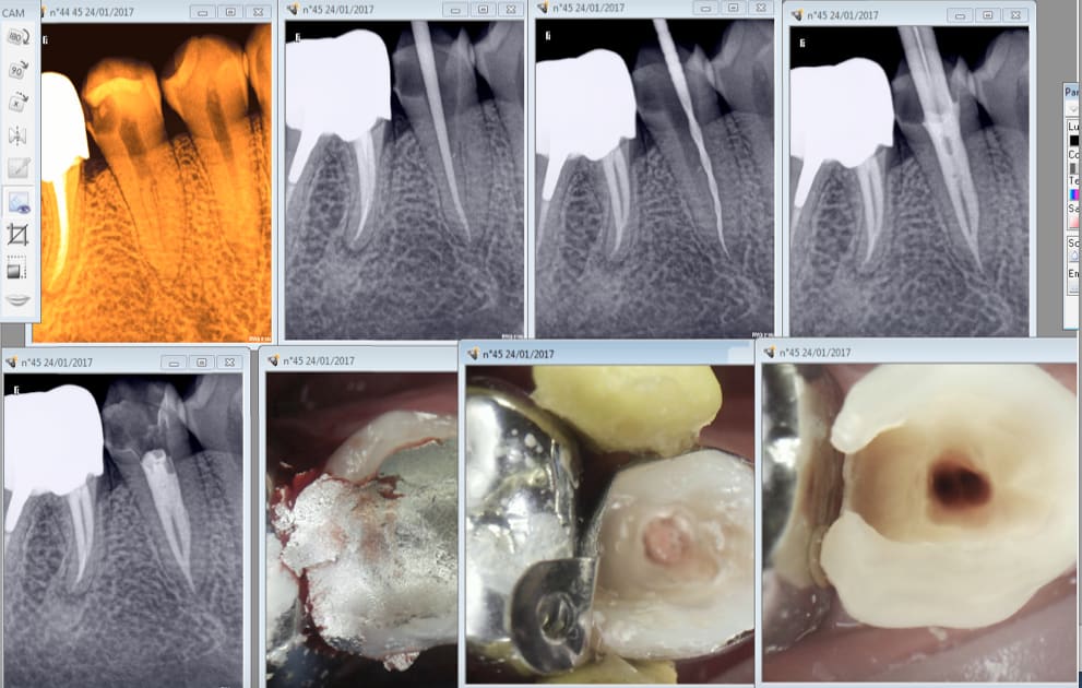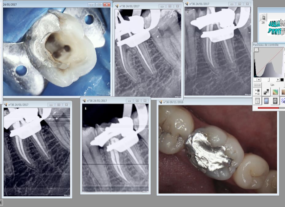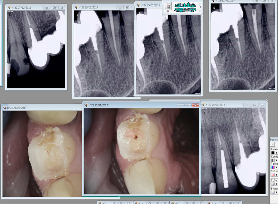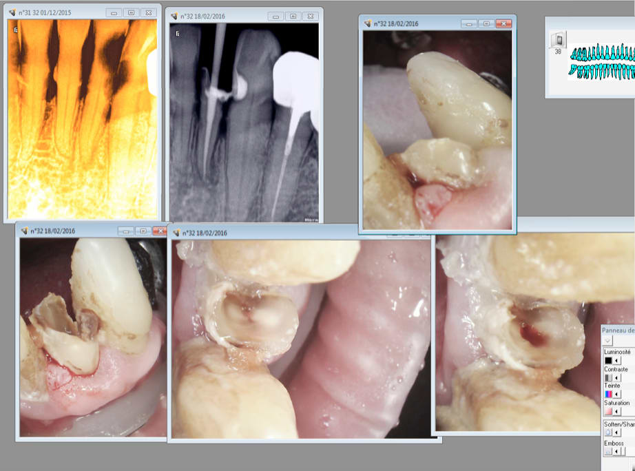 le patient decide de mette des implants sur les secteurs postérieurs et un bridge englobant toutes les dents inférieures (implants et dents résiduelles). Et donc j'ai procéder aux traitements canalaires de ses incisives (test de sensibilité positif) pour ensuite passer à la taille; et là aucune lime (meme la plus fine) n'a pu franchir l'entrée canalaire; sachant qu'il apparaissait un filet de lumière canalaire sur la RVG. aucun resultat alors j'ai essayé avec la rotation continue mais j'ai creer un faux canal. alors après un temps fou passé sur ce patient j'ai mi une mèche d'hypochlorite à l'entrée du canal et un pansement.