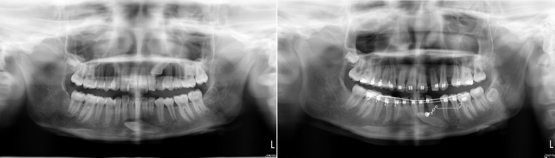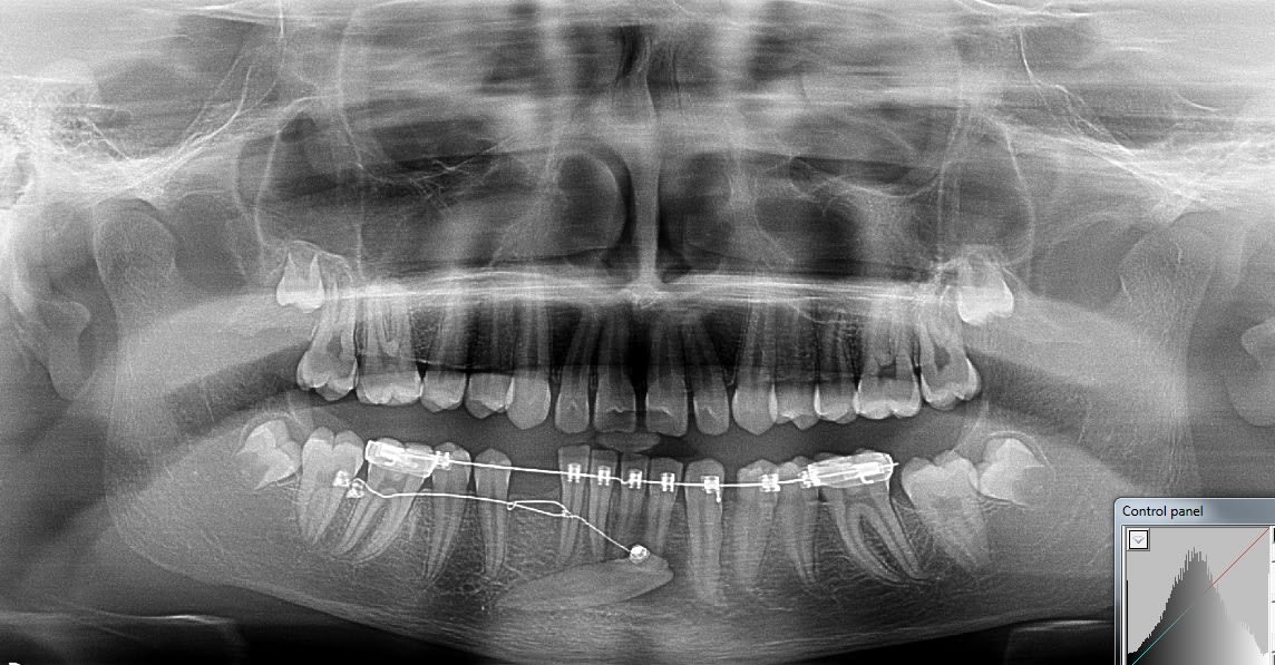 La patiente avait besoins d'un traitement ortho ( une canine impacté en haut aussi ) donc j'ai intégré la traction avec l'appareillage et pas besoin d'utiliser de minivisse.