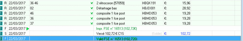 Nouvelle patiente : 2 rétro coronaires ( gentil chicot ca aurait mérité un status complet car tt ortho antérieur : antécédents de soins intensifs) 3 compos et un detartrage ( un seul gentil chicot) 102,72 alors que ca aurait pu faire 195,48 ( moins 29,92 divisé par 2 il y a un bug dans julie le double détartrage à moitié du tarif ne s'affiche que quand on édite la feuille de soins et n'apparait pas en shéma plan de tt) . -)))