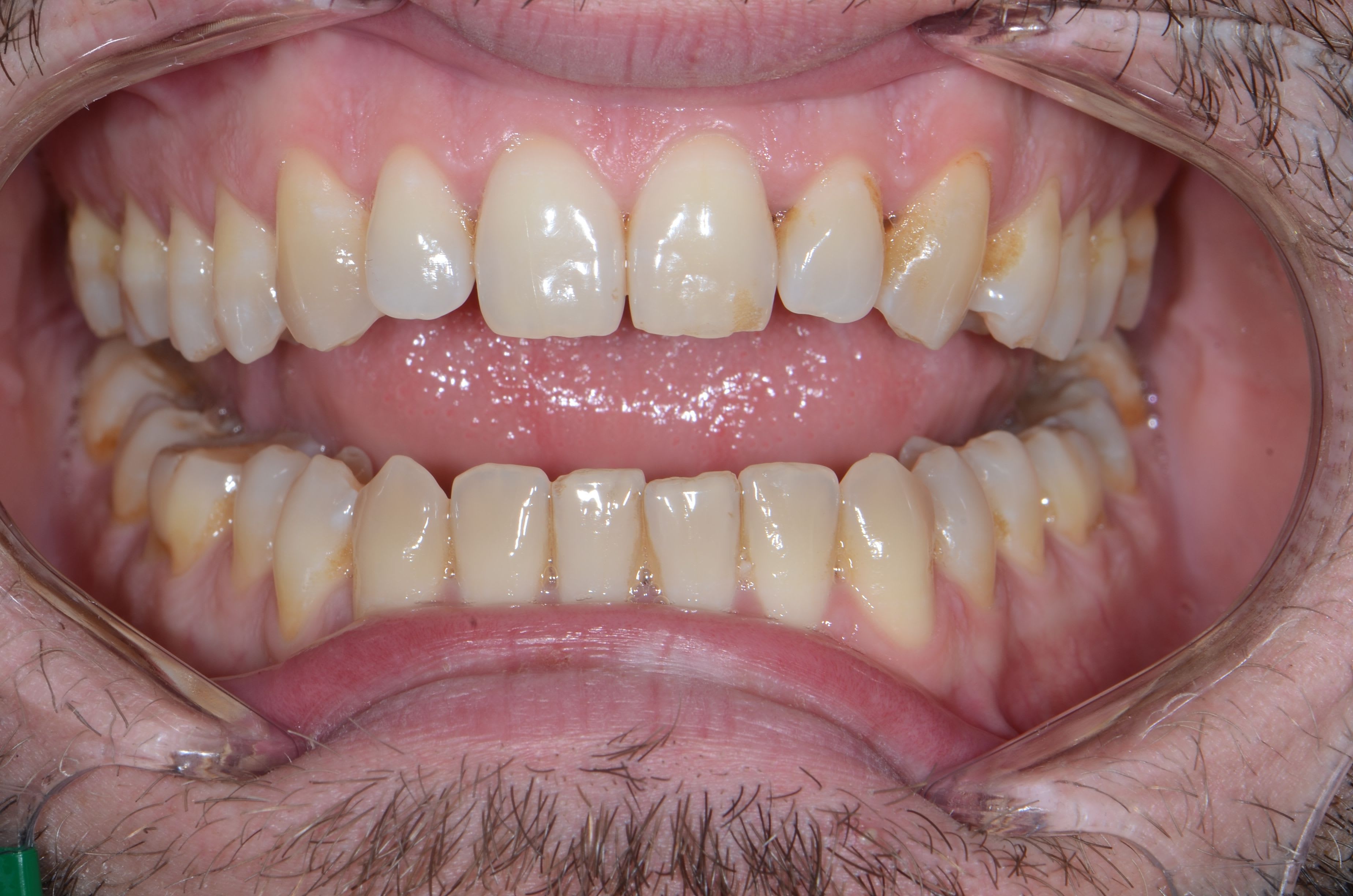 C'est un cas plus compliqué qu'il n'y parait au niveau ortho et qui peut vite foirer si on ne fait pas attention. Il faudrait confirmer à l'aide d'un ceph mais les incisives supérieures et inférieures semblent retroclinées donc attention lorsque l'on va corriger les compensations à ne pas se retrouver en cross bite et open bite antérieur. Les incisives latérales semblent également petites et nécessiteront une reconstruction à confirmer avec une analyse de bolton.