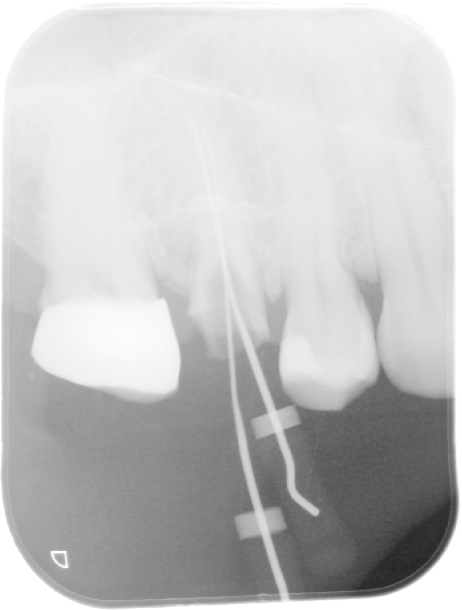 On va sans doute refaire un i core si la dent reste asymptomatique histoire de bien sceller les racines et attendre quelques mois avec une provisoire par dessus parceque du coup vu que j'ai pas atteint l'apex mais fait disparaitre la fistule je subodore un loup genre félure....