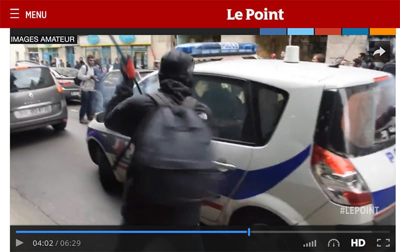 Casqués, masqués, matraque et barres de fer en main, les manifestants n'hésitent pas à taper sur les deux jeunes policiers après avoir brisé la vitre de leur véhicule. Les policiers tentent alors de se dégager. En vain... Les casseurs ne lâchent pas