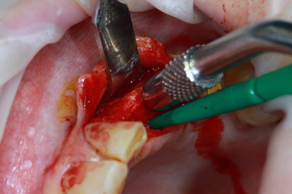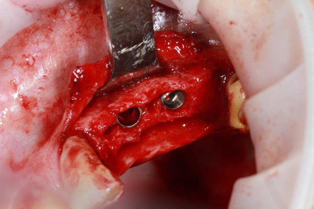 en général (99,9% des cas) je ne constate aucune lyse osseusecrestale, ce type de chir. est très douce pour l'os, lame 15, et ostéotomes, pas de forage, pas de consommation d'os, pas d'agression ni de lavage (piezzo), et je fais toujours attention à laisser du sang (sauf pour les photos) ce qui est le meilleur pansement pour l'os.