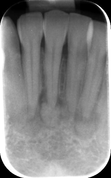 Patiente de 45 ans avec deux incisives mandibulaires qui ont changé de teinte, sans signes cliniques particuliers si ce n'est une légère sensibilité à l'apex de ces dents.