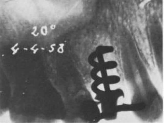 1938 : Strock posa Le premier implant sous forme de vis qui est resté en bouche 17 ans ( implant en Vitalium) . Et on remarquera qu'il ressemble étrangement pour beaucoup aux Implants modernes. En 1937-38 ils avaient déjà presque tout compris.