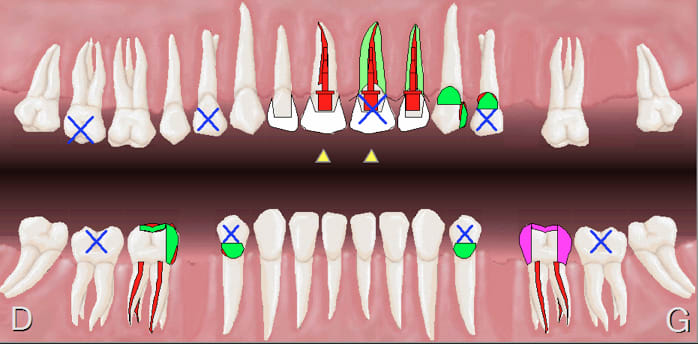 2 dents manquantes. Je vais tester l'implant à 500 euros d'un coté et Bridge avec 2 IC à 500 % de l'autre. Histoire de voir si je suis dans la moyenne du référentiel région.
