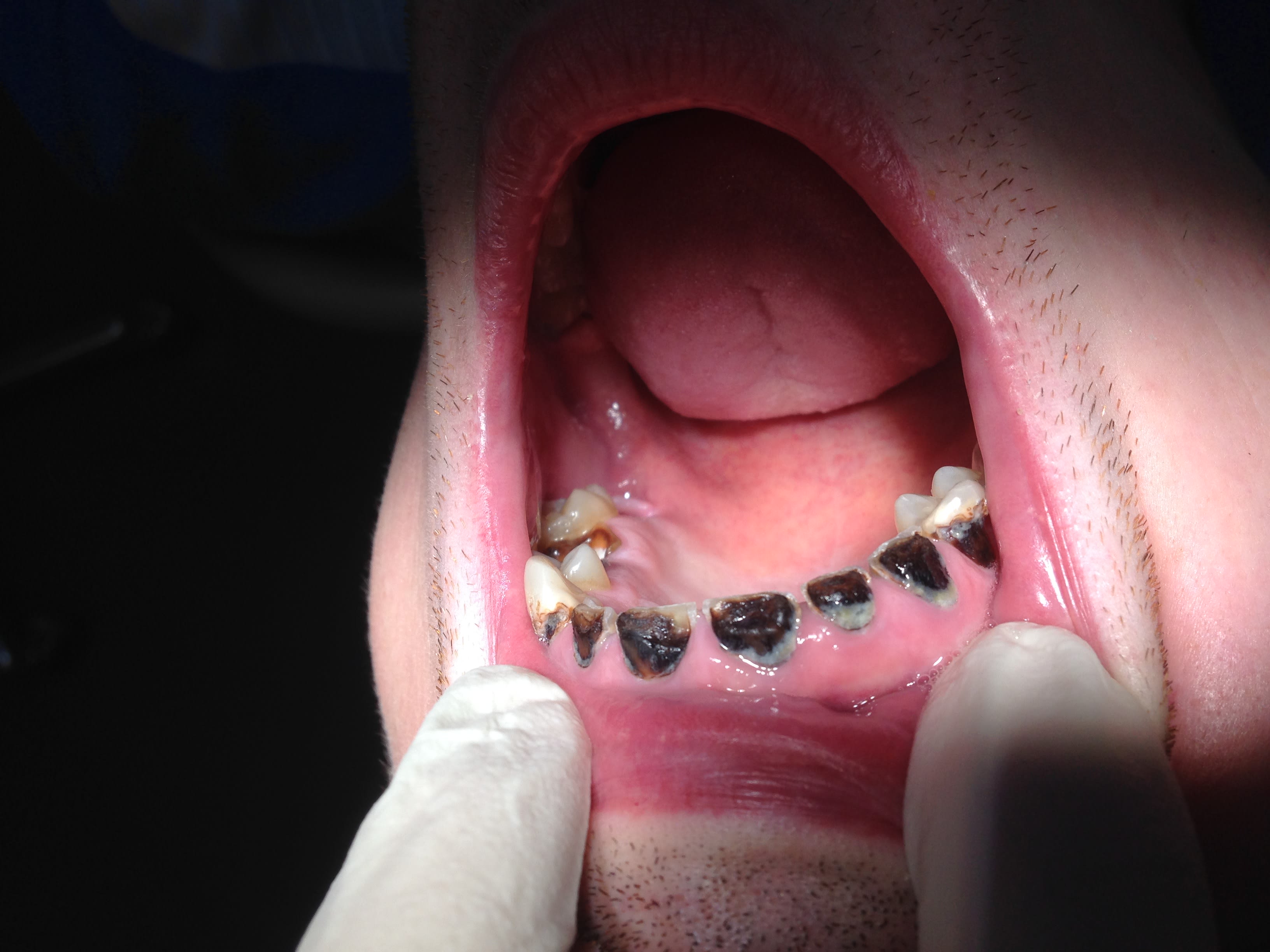 Ce sont des dents pourries : l'indication c'est extraction . Et En plus il a mal aux dents. J'allais pas lui donner des ATb antalgiques pour repousser l'échéance