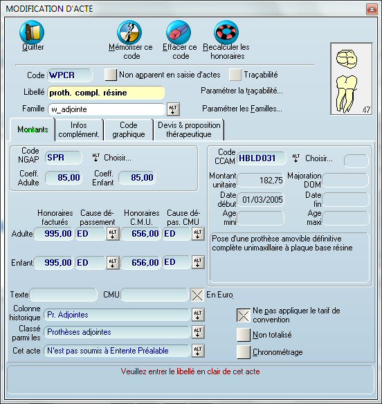 Depuis peu, j'ai un rejet par Julie pour le devis de l'acte HBLD031 (prothese complete resine unimaxillaire), non compatible ccam.