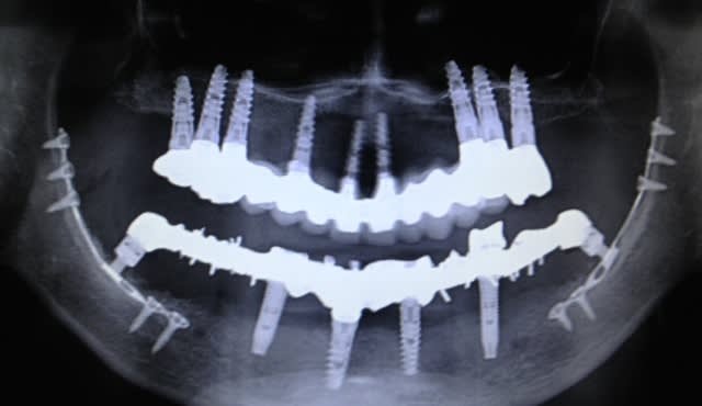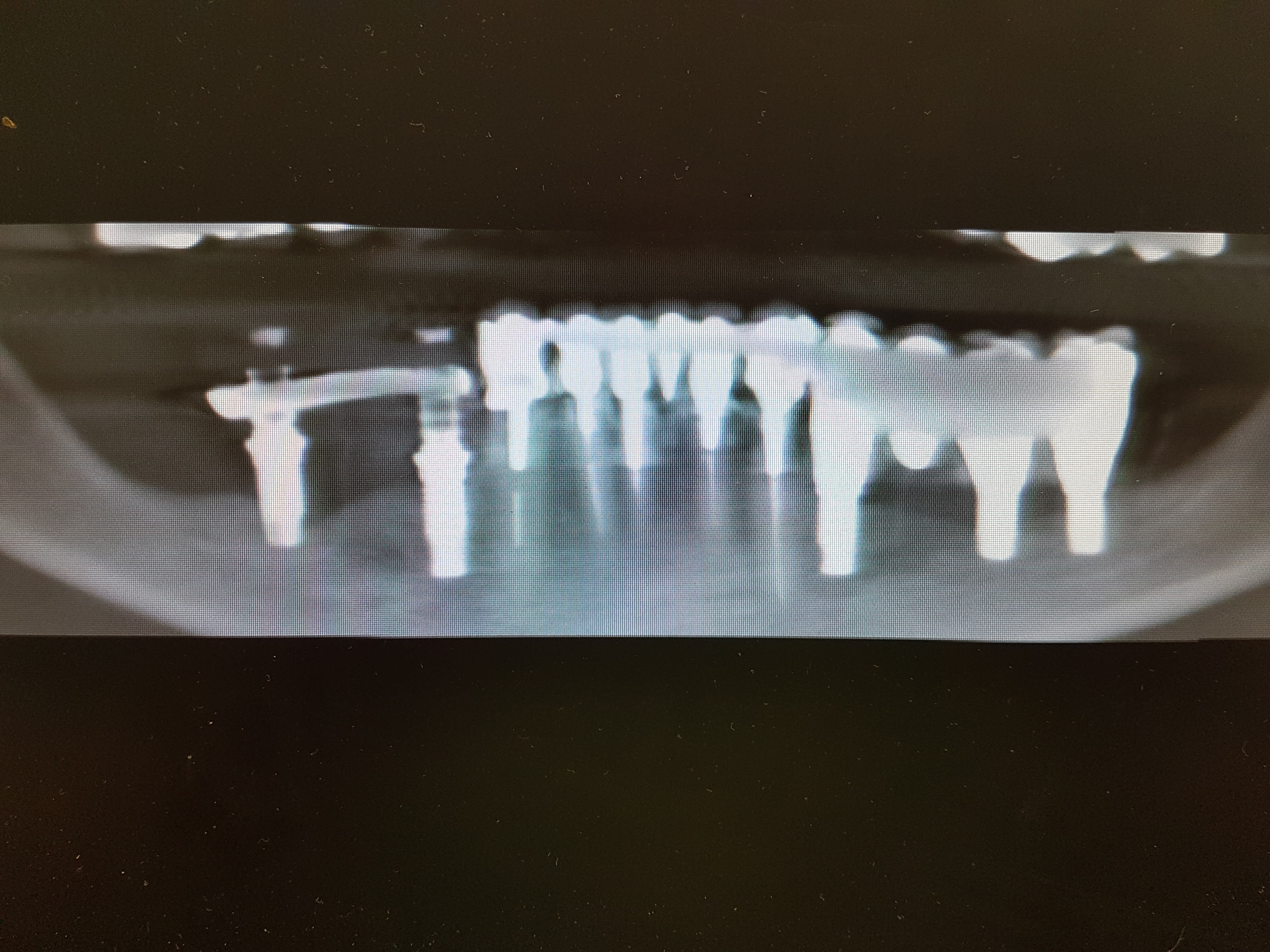 prélevements au menton et au ramus pour des greffes dans les secteurs III et IV puis pose d'implants en 34 , 36, 37 , 44 , 47 . bridge ceramo metal scellé 34 à 37 et bridge provisoire sur MUA toujours en place sur 44-47 . tout ceci a été réalisé il y a environ 2 ans .