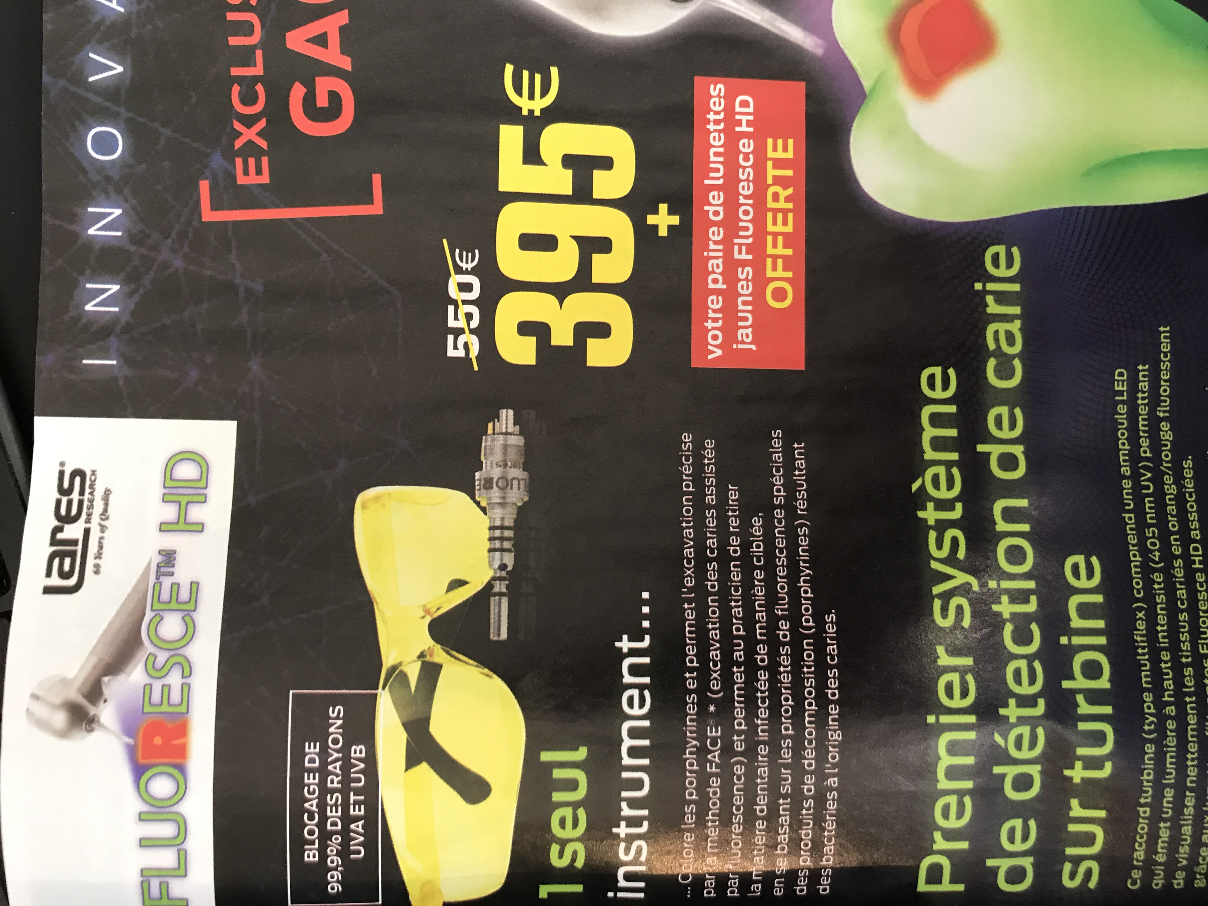 un raccord que l on met au niveau de sa turbine avec des lunettes spéciales et qui permet de voir le tissu carieux : du coup plus de contre angle bague bleu e et de fraises qui vibrent et plus de controle à savoir ou on en est avec la sonde