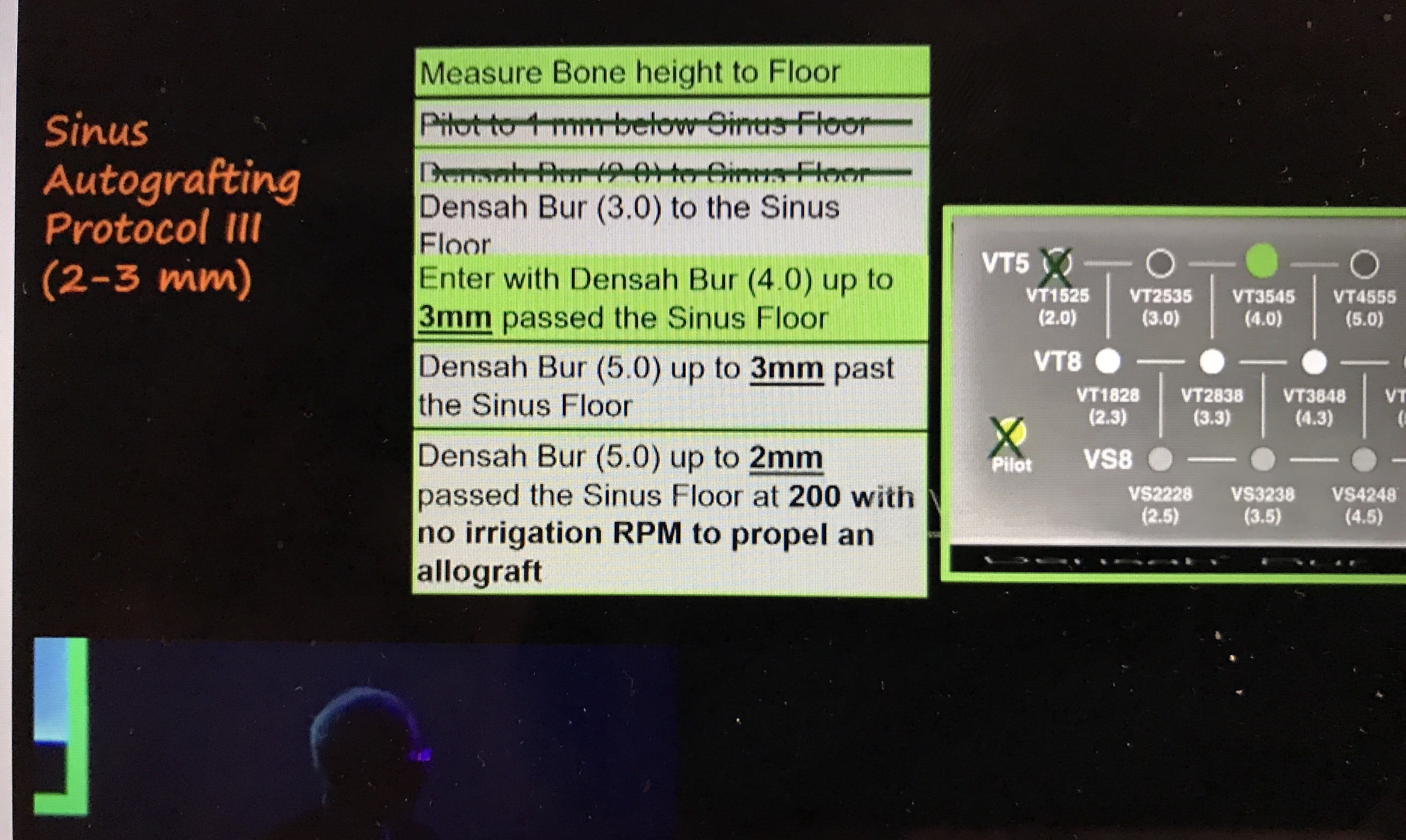La procédure est simple, mais varie selon la hauteur sous sinusienne, à savoir plus ou moins de 4 MM. Avec 2,5 mm, j'ai foré sur 1 mm avec le pointeur, puis passage du foret 3.0 mm en mode reverse à 900 tr/min jusqu'à la corticale. Ensuite une fois cette dernière passée, on repousse la membrane toujours en mode reverse en veillant à ne jamais faire pénétrer le foret de plus de 3 mm dans le sinus.