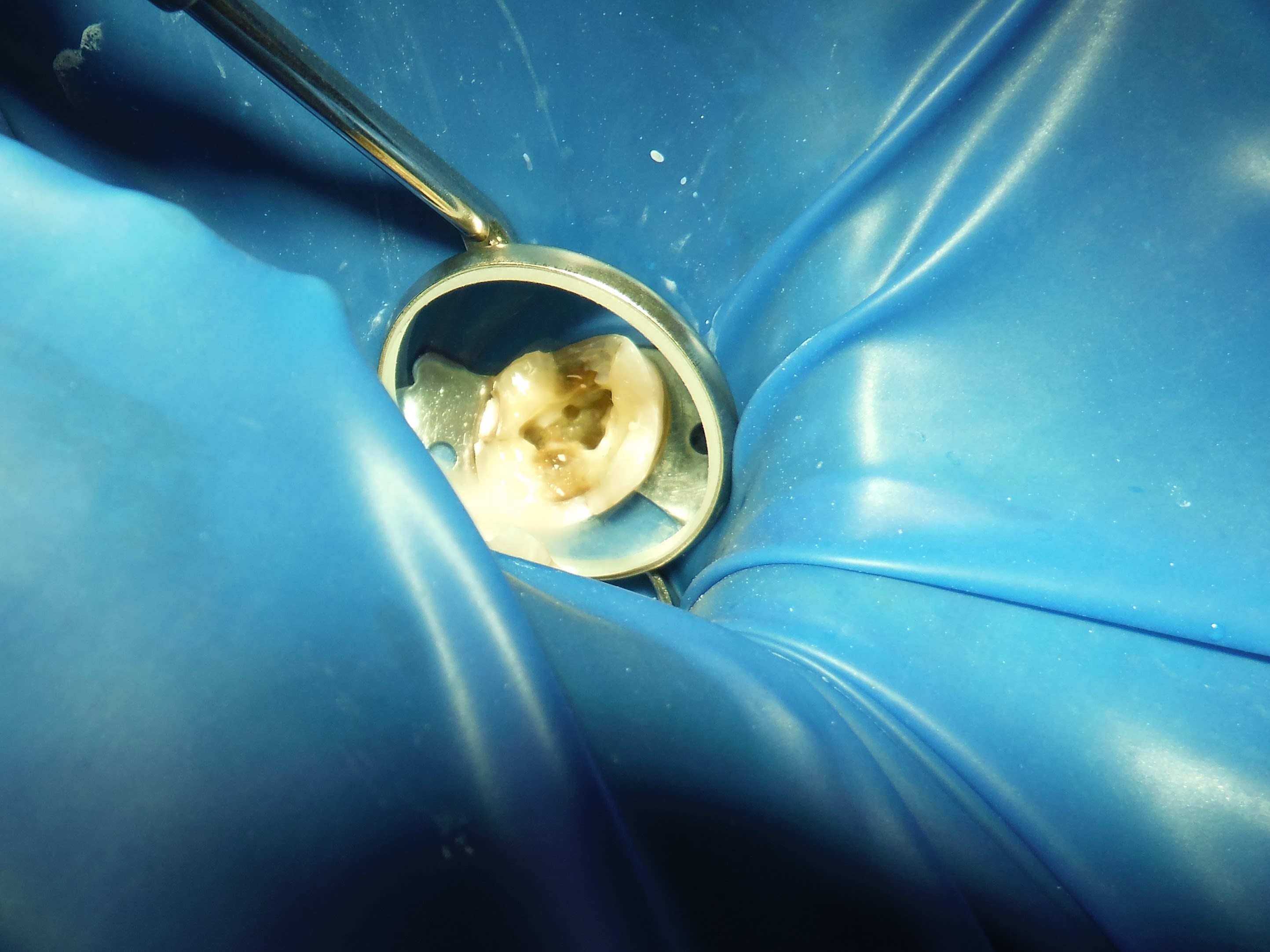 Il y en avait aussi un gros morceau en palatin, tu l'avais pas vu? carie sous gingivale avec proximité pulpaire en P (probable boulimique), je vais faire une CCR, suis d'un autre temps... avec paracore +tenon sur la cavité principale et un amalgame en palatin (étanche, travaille bien en sous gingival et peu sensible à la reprise de carie) c'est cela aussi l'économie tissulaire... ah! Pour les sensibles que cela choque, je vous préviens, j'ai du biscuit ;-)))