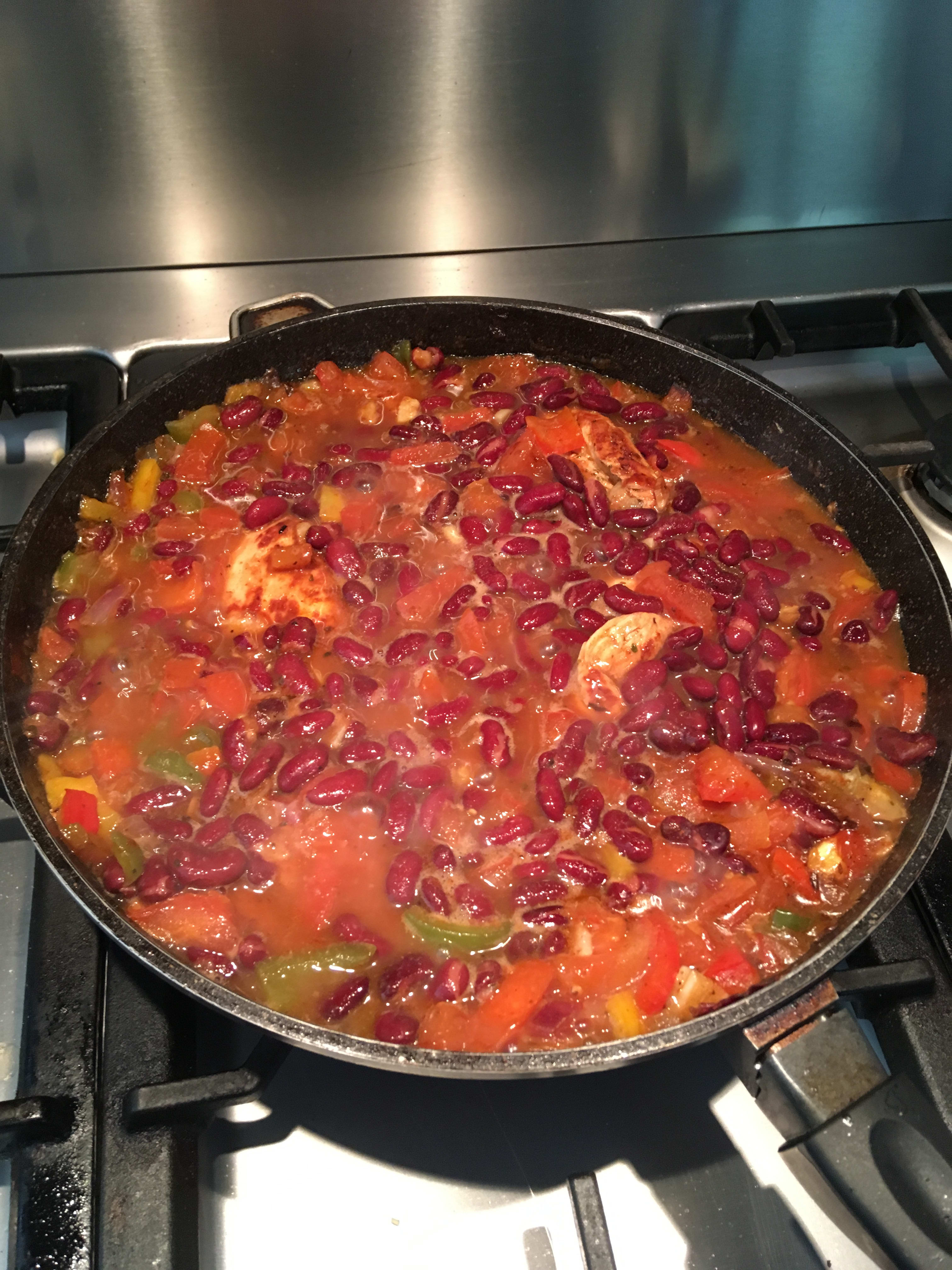 C’est du poulet à la texane! J’ai inventé ça avec ce que j’avais sous la main.... à la base ce devait être poulet basquaise mais avec des blancs c’est bof et pi je voulais pas faire à riz.... du coup j’ai rajouté du Chili et des zaricots et du maïs (pas sur la photo).