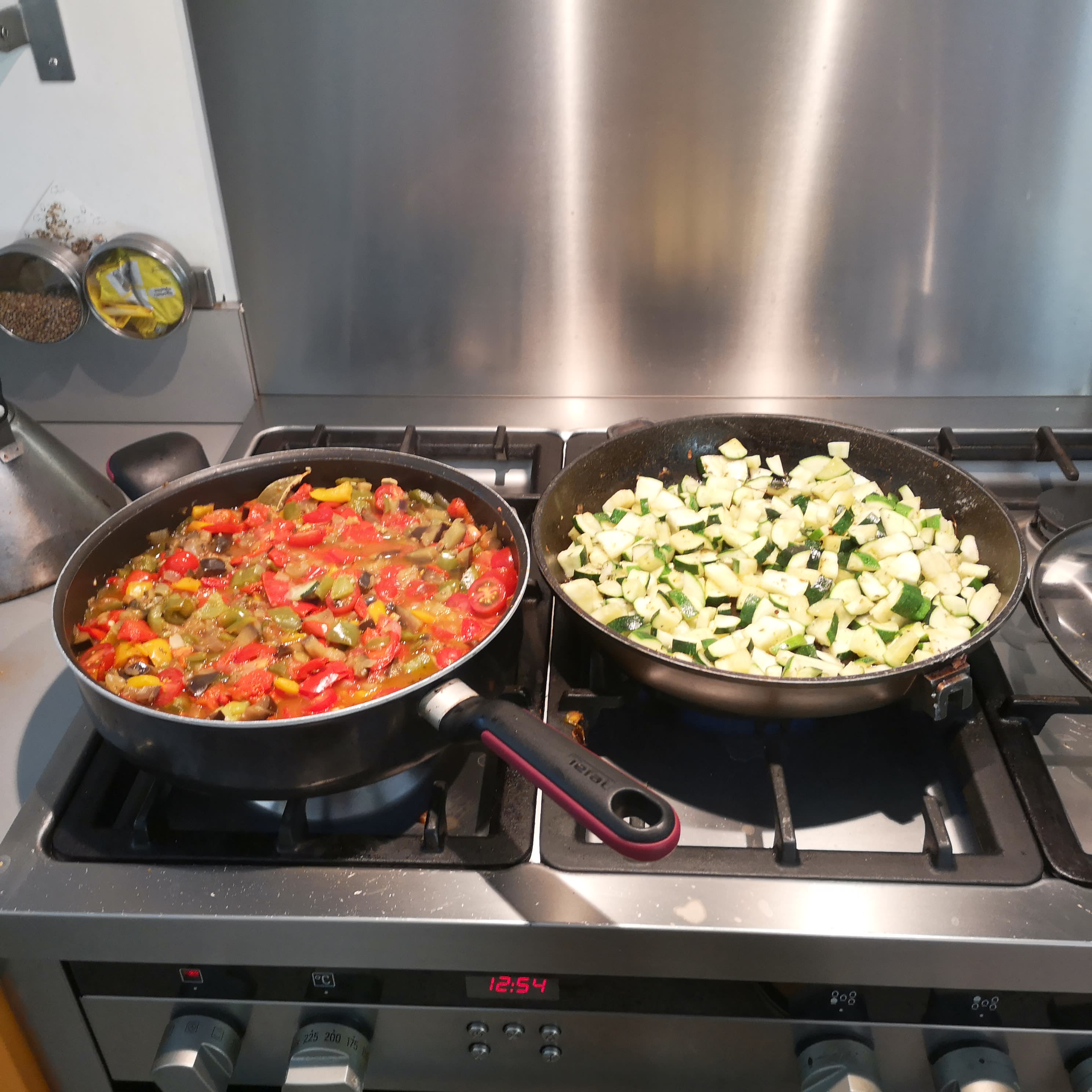 . Faire revenir séparément les ingrédients, d'abord ail à oignon et poivrons, puis les aubergines, ensuite les courgettes.
