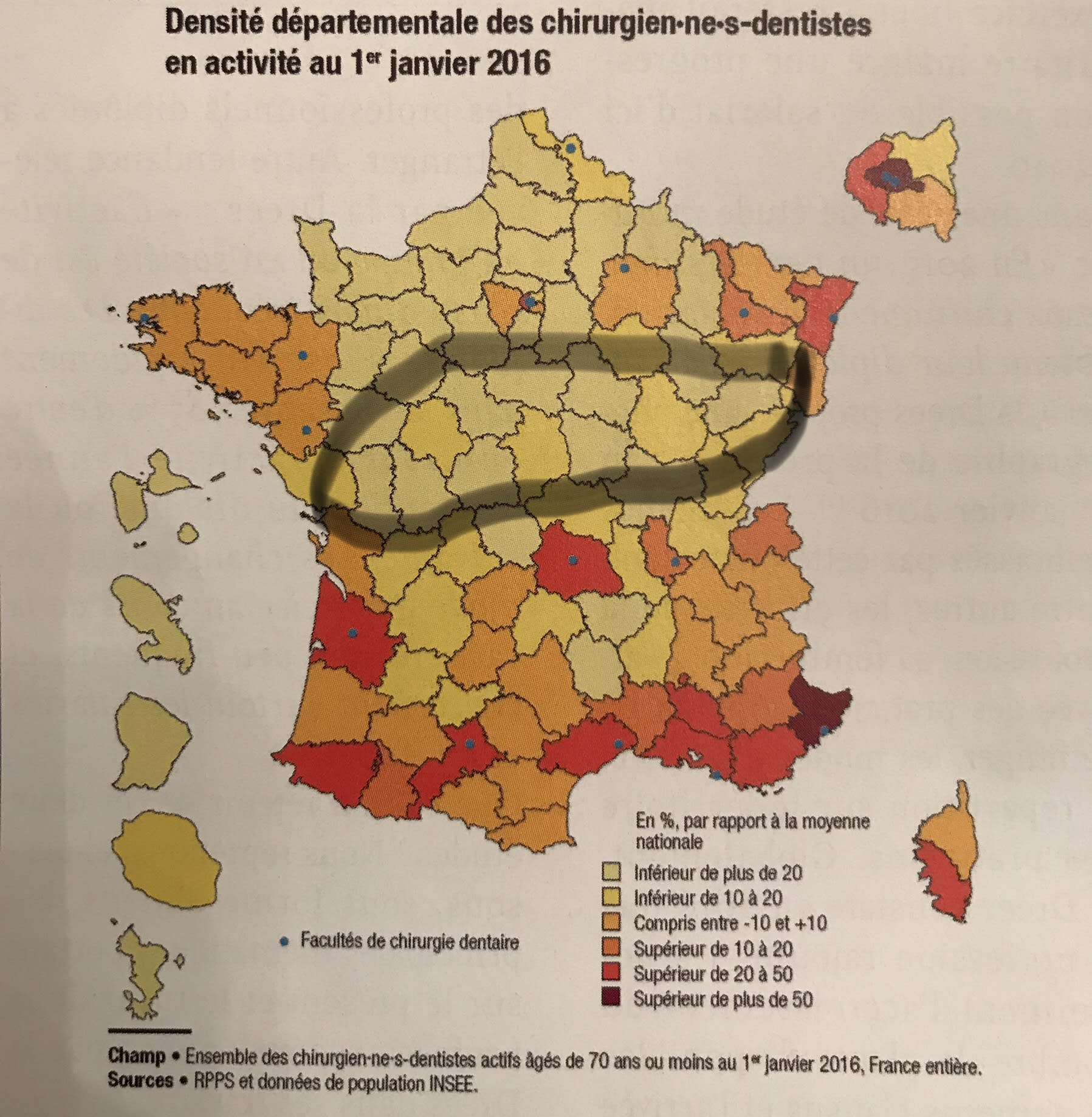 3) comme 40% des dentistes s’installent dans la même région où ils ont étudié -> on se retrouve avec des grandes disparités. Le Sud est blindé de dentistes car il y a beaucoup de facs . Et inversement on a pas de dentistes dans le centre car les facs sont mal réparties sur le territoire