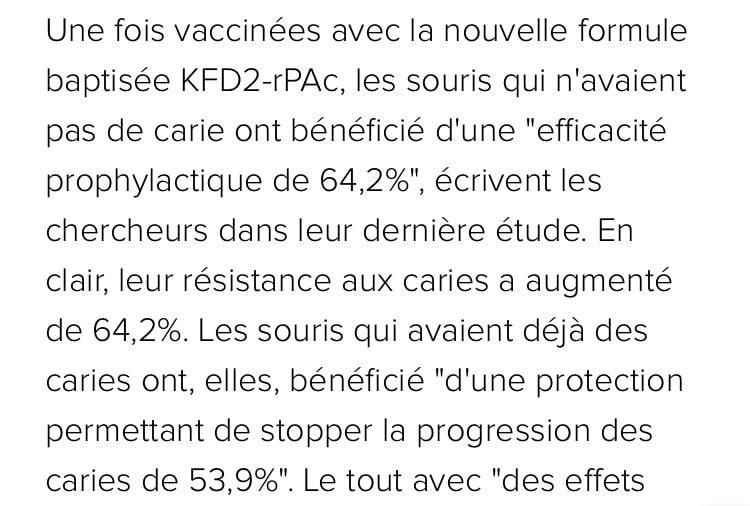 De plus cette histoire de vaccins est du niveau de Voici, on a fait baisser les caries chez la souris, tu as bien lu la souris, la souris ne se goinfre pas de sucrerie, de MacDo et autres saletés.
