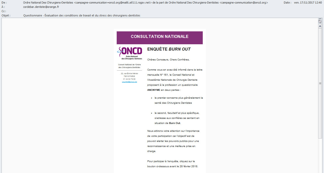Le lien vers le questionnaire a été envoyé par mail en novembre par le Conseil de l'Ordre national.