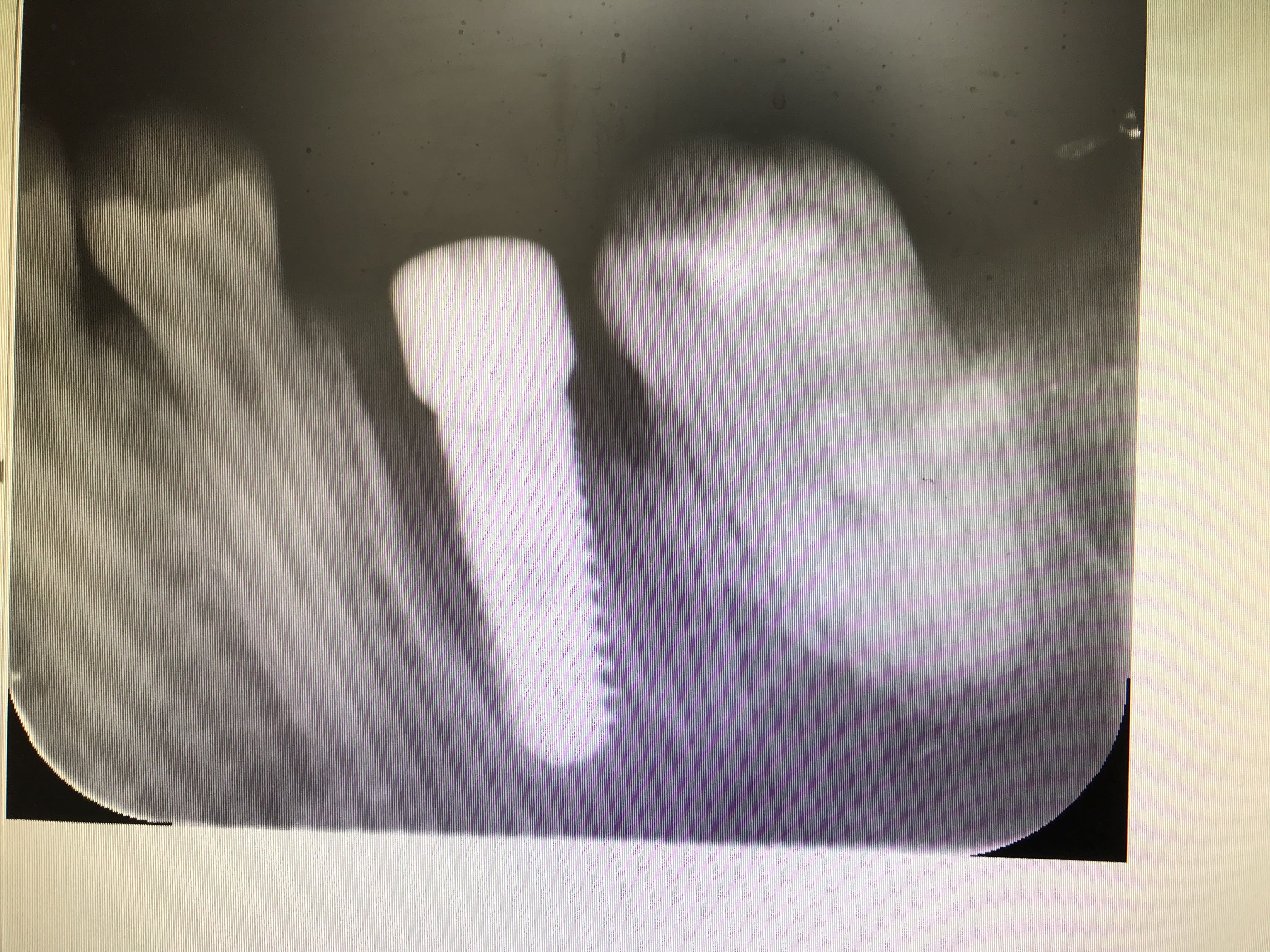 Bon à ce que je vois sur la radio hein! Mais souvent je ne pose mon diagnostic qu'avec la radio, un panoramique en général. Pas besoin de regarder dans la bouche, en plus y fait noir là dedans et c'est pas toujours très propre. Une radio est bien suffisante... j'aime bien ce mot.