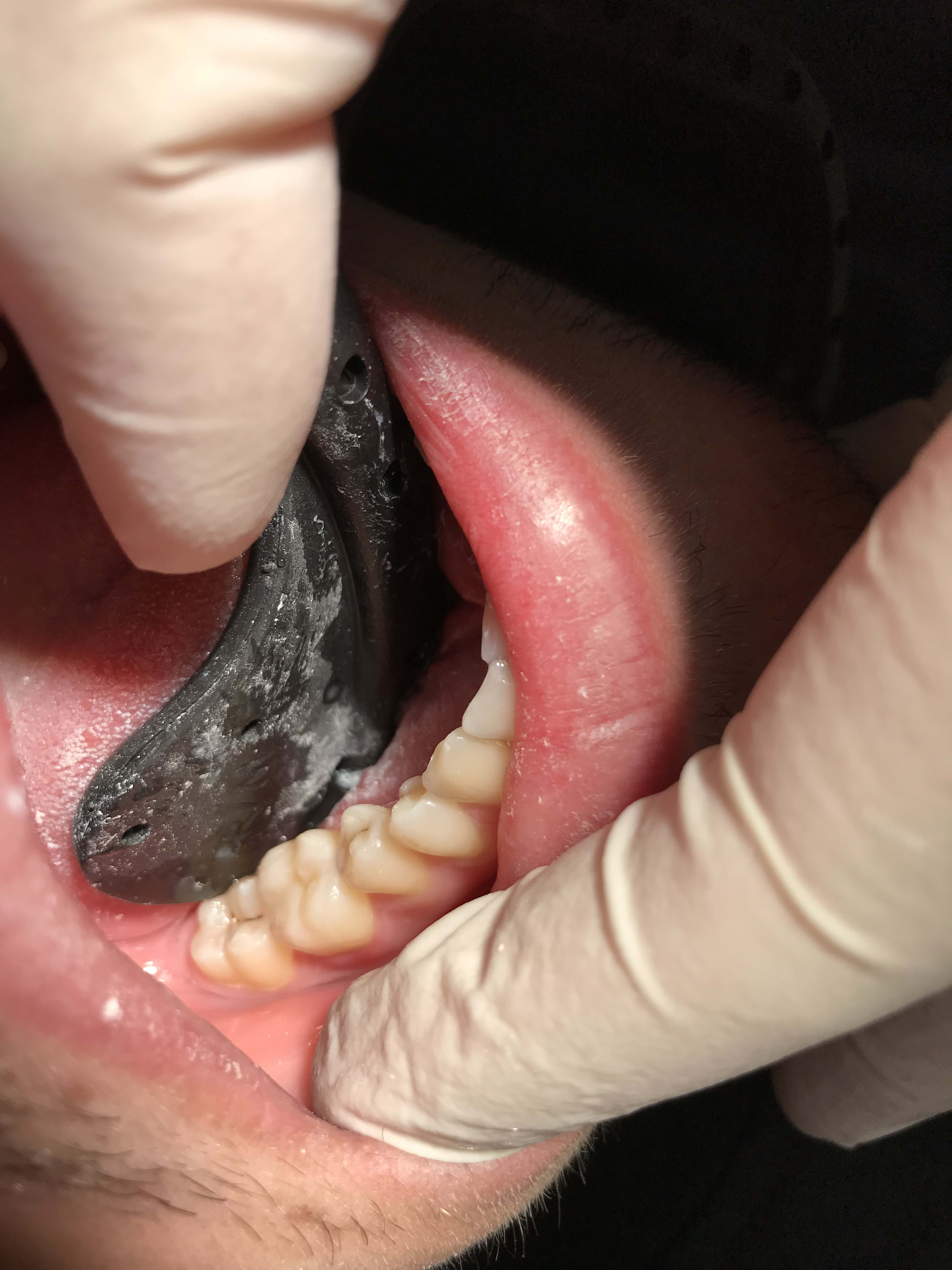 J'ai mis du téflon sur les dents maxillaires, puis mordu silicone, j'ai retiré le téflon et mis un light uniquement sur les faces palatines. C'est suffisamment précis pour l'adjonction et soft pour les dents.