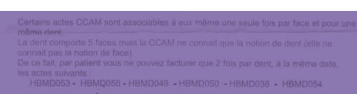 Même problème que pour 3 ou + 1 face où la sécu croit qu'on est limité pour la dent alors que seulement pour maxi 2 x 1face sur la même face ? mais est-ce noté dans la CCAM leur données CONDOR ? (nom du libellé d'anomalie pour "Multiples facturations dentistes")