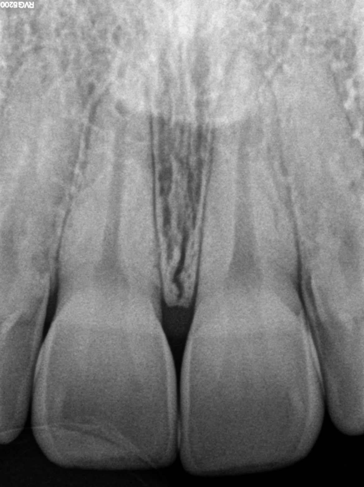 J'ai l’impression de voir 2 boulettes de résorption interne dans les 1/3 apicaux sur les centrales ?