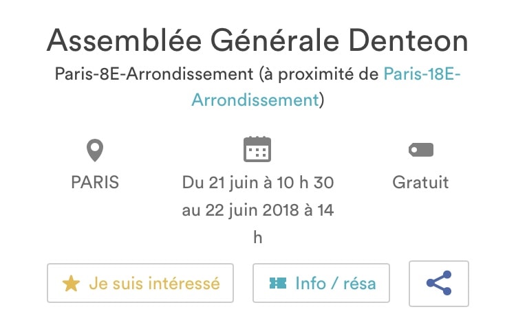 Si tu veux t’y inscrire, il y a une assemblée Denteon bientôt : c’est gratuit :) ... On lance des graines pour attirer le pigeon . Le pigeon mange ces petites graines .... « mmmm ! C’est gratuit ! Que c’est bien bon , elles sont jolies ces présentations et ces belles plaquettes , que c’est une bonne idée : un label rouge pour pigeon » . Et puis un jour faut payer les petites graines , au début c’est jamais trop cher, alors le pigeon paie . On le gave bien avec ces graines puis ensuite on le plume et on le farcit bien comme il faut , et enfin on le cuit au four comme si c’etait une pintade.