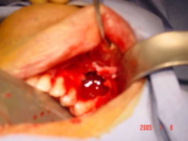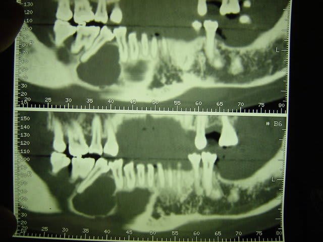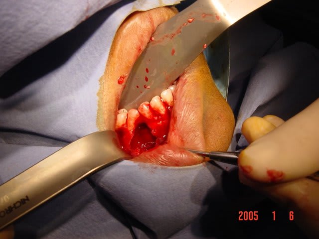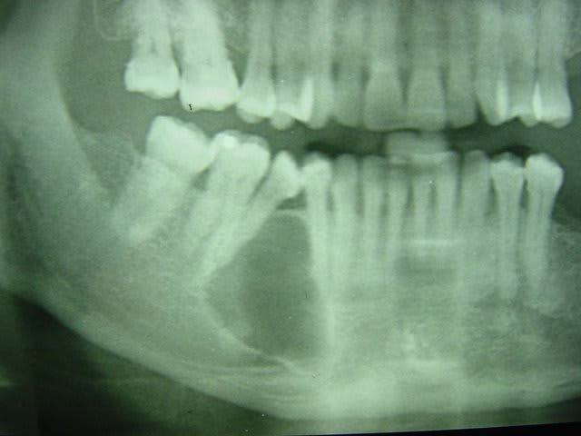 Pour l'énucléation, tu as décollé tout autour puis tiré à la fin sur la poche kystique sans cureter les parois osseuses dans la région du trou mentonnier?