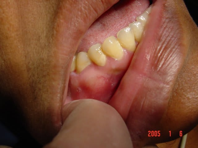 si tu regarde le scanner tu verras que le foramen mentonnier a ete completement repousse au niveau du rebord basilaire par le kyste (desole je ne sai plu quelle numero de photo )