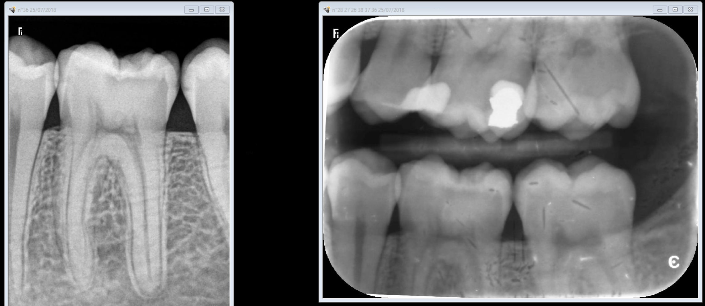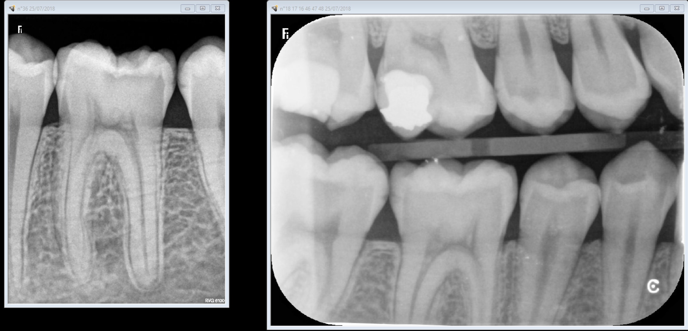 Le stratagème est gros ! Tu nous montres un cliché de capteur rétroalvéolaire , avec une accentuation de netteté logiciel au maximum, d'un côté, avec un cliché rétrocoronaire d'une plaque pourrie ( cf défauts de surface), sans accentuation de netteté !!