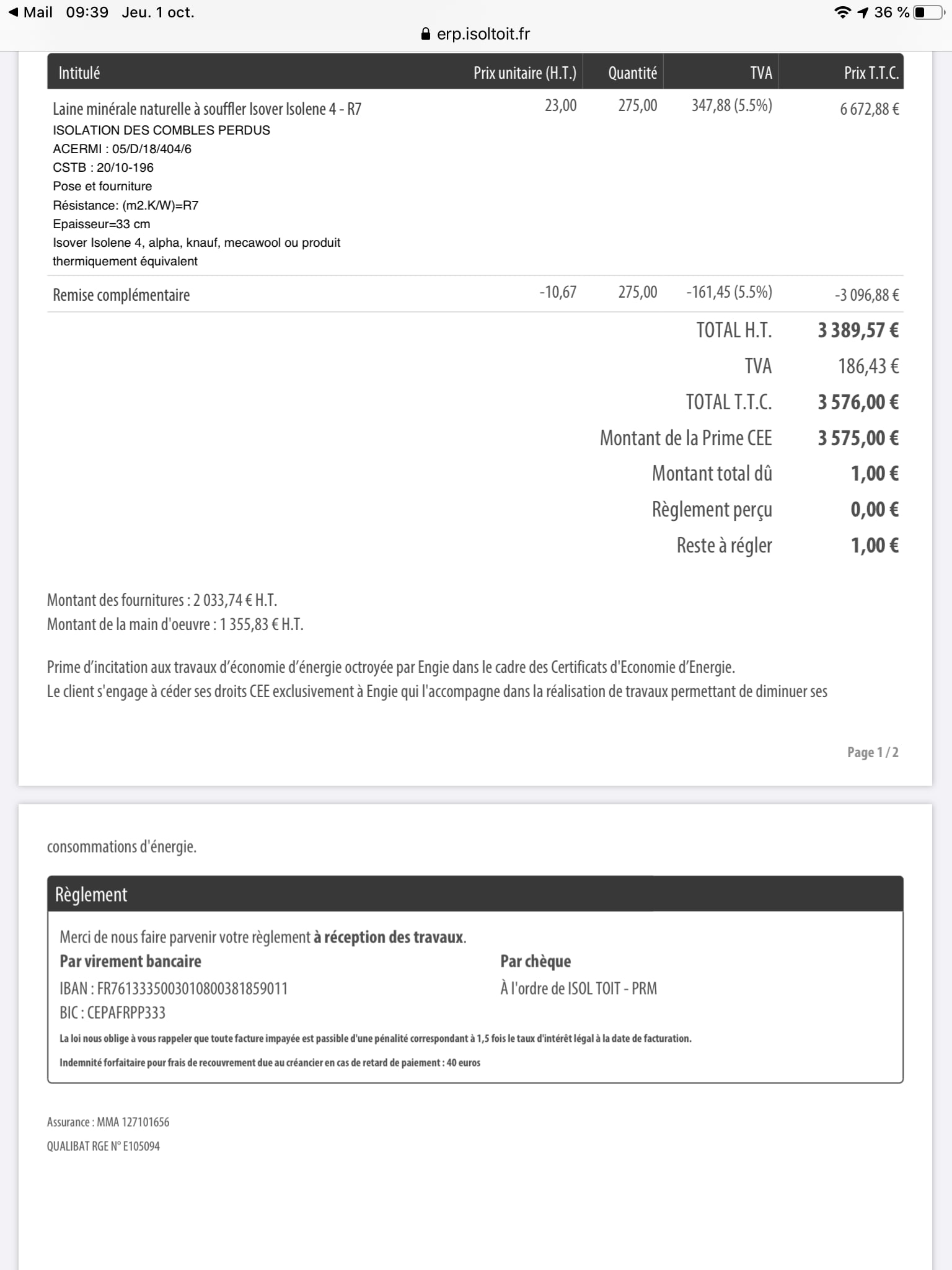 Bon, c’est fait ; nous avons pu bénéficier de l’isolation des combles de la maison pour 1€.