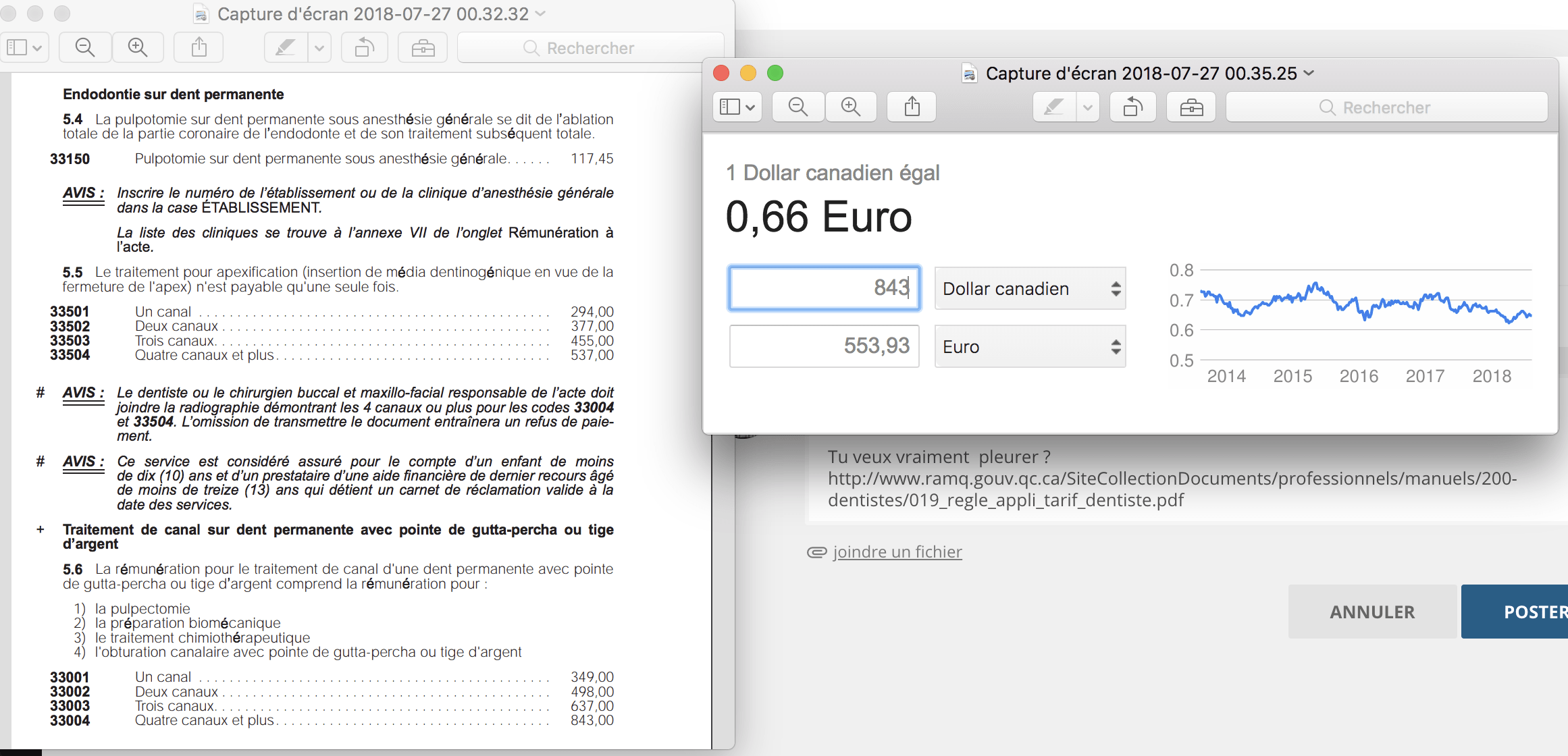 Eh les assurés francais vos dentistes ont accepté des tarifs pour les traitements endodontiques sur les molaires à 81,94 euros alors que les dentistes québéquois refusent des tarifs à 553 euros. Autant vous dire que faut vraiment que vous ayez du bol pour tomber sur un dentiste français qui vous fasse le boulot correctement. -))))
