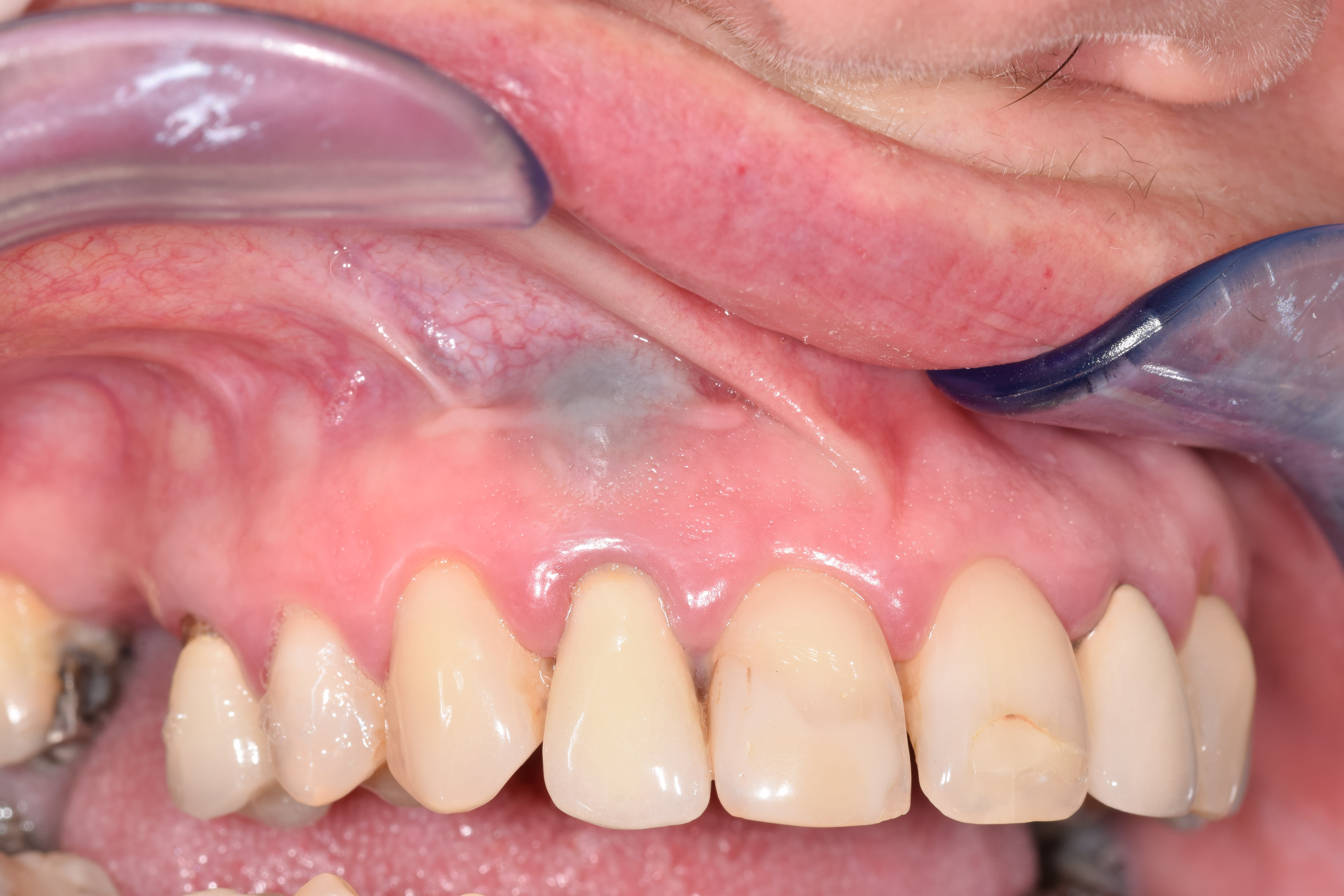 la 12, traitée endo, avec une couronne à adaptation correcte, dont l’esthétique convient à la patiente. 1 résection apicale faite il y a qqs années avec obtu à l'amalgame. une lésion kystique de env 1cm de grand axe s'est installée depuis au moins un an. Au cbct : lesion centrée sur l'apex, avec une fenestration vesibulaire, ne s'etendant pas jusqu'en palatin. (malheureusement j'ai pas acceès aux rx en ce moment, seulement une photo pre op...)