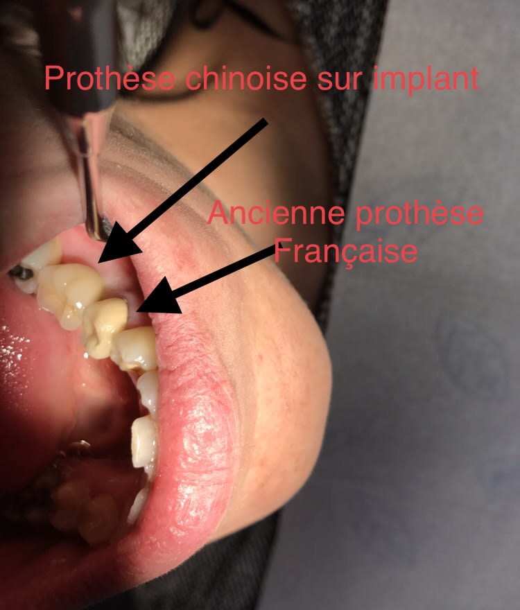 Pas de problème, allez je t’en prends une au hasard. Là je te mets une prothèse que je viens de poser. À coté tu vois une belle prothèse française faite par un ancien. Mon but n’est pas de critiquer l’ancien dentiste qui malheureusement a été obligé de poser ça parce que son prothésiste français ne pouvait pas mieux faire
