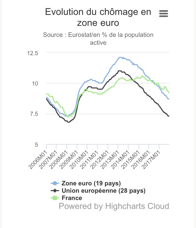 Comme vous pouvez le voir le taux de chômage en France est l’un des plus mauvais de la zone euro. On remarquera même que sous Macron la baisse du nombre de chômeurs est moins importante que dans l’Union européenne ....