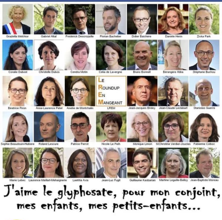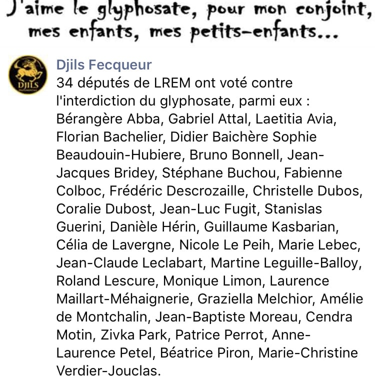 Et puis il ne faut pas oublier aussi les 34 députés de la république en marche qui votent pour le glyphosate. 34 députés qui votent pour notre empoisonnement