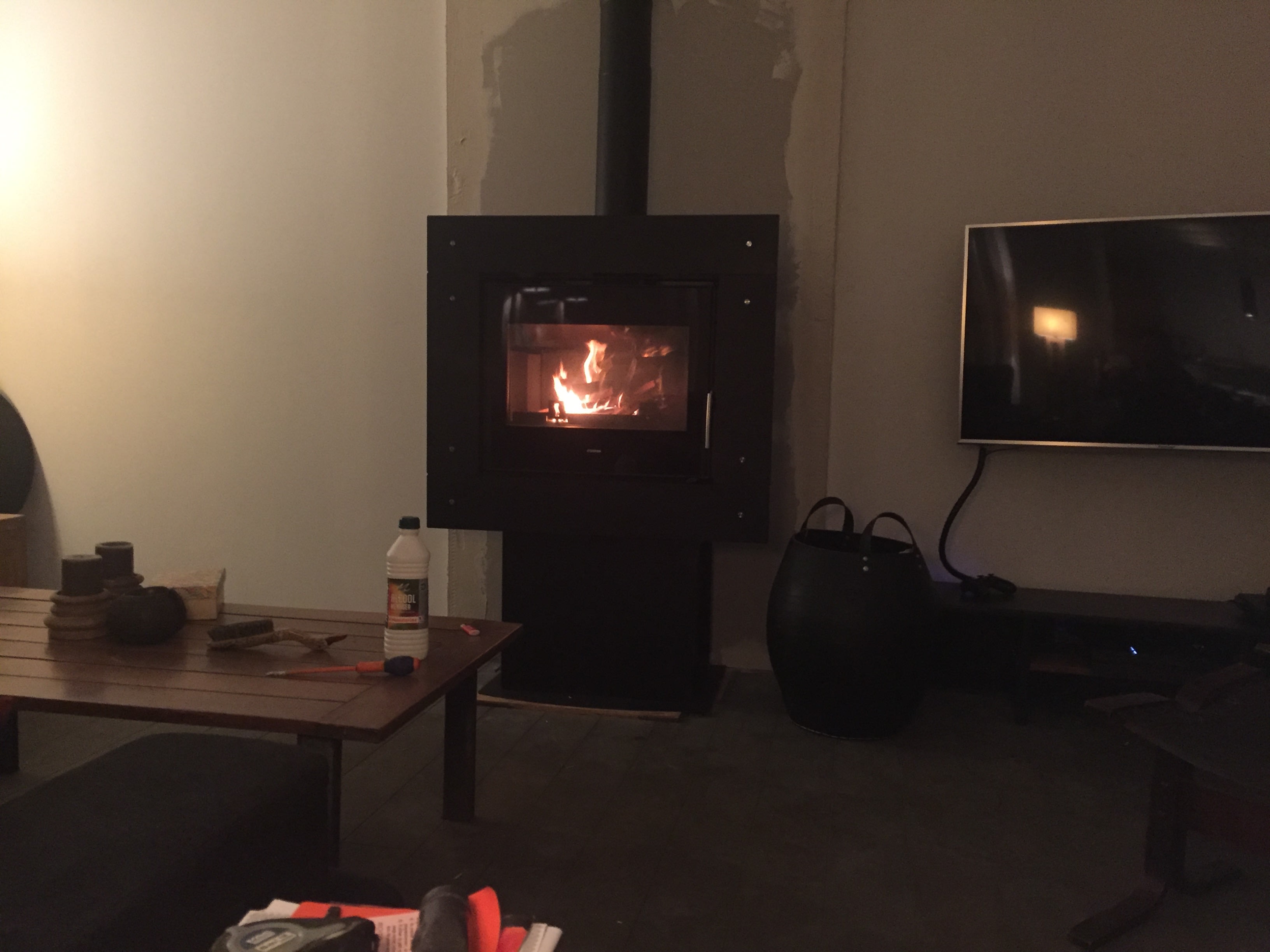 Et oui la bise étant prévue , je décide dans les travaux restants de la maison de faire les raccordements de poêle qui étaient en suspend depuis 5 mois . Fin de journée , hé smithy on se fait une flambée d'essai . Une flambée à la Gainsbourg , mais en bien plus chère ;o)))