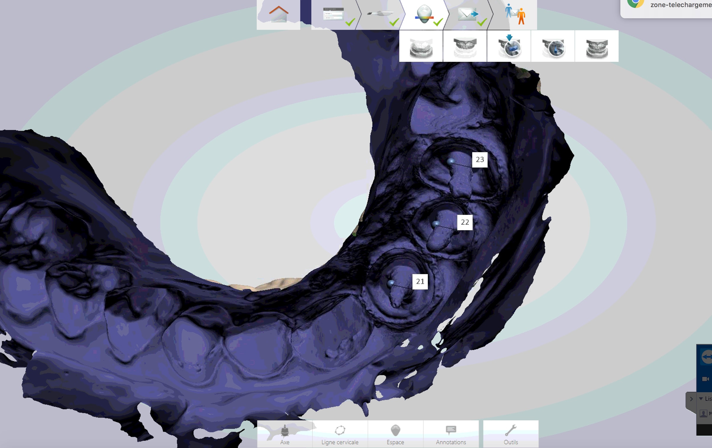Pour ce qui est du labo, on bosse sur Exocad, Dentalwings via 3shape Communicate, ou directement sur 3shape (en fonction du labo).