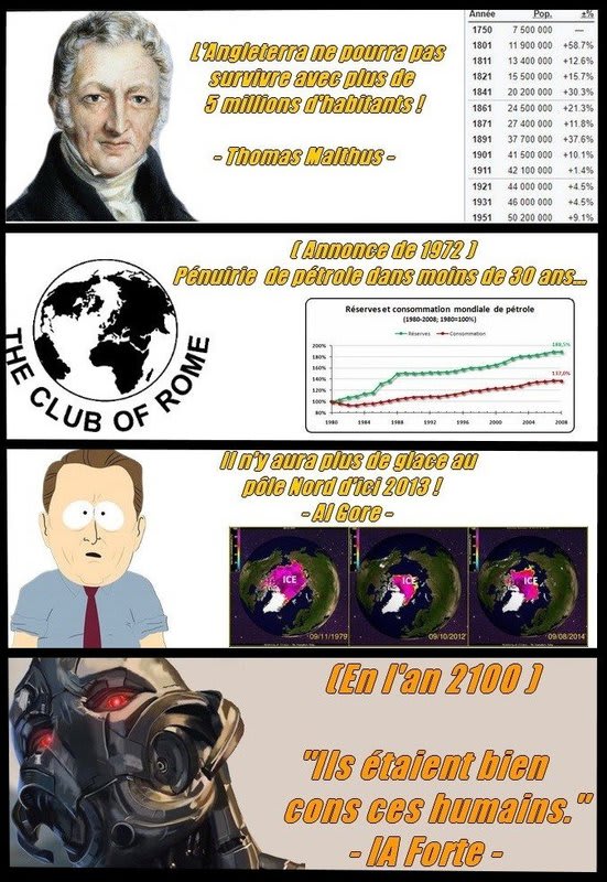 Barbapapa, la prévision n'est pas devenue fausse, elle a toujours été fausse car elle n'a jamais pris en compte ce que l'on ne sait pas encore, et après au moins 2 millénaires de prévisions toujours partout systématiquement fausses, car nous sommes ignorants des futures inventions humaines, il faudrait arrêter une bonne fois d'agir pour l'avenir avec l'argent et la vie des autres, et simplement gérer le présent au mieux. L'avenir, c'est le boulot des entrepreneurs et des inventeurs, surtout pas des politiques et encore moins des écolofachos.