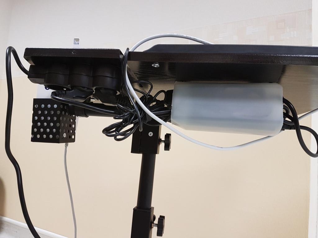 déjà la multiprise est vissée sous la tablette, de même qu'une bouteille plastique (solution hydroalcoolique pour les mains) coupée des 2 côtés pour y loger les transfo...