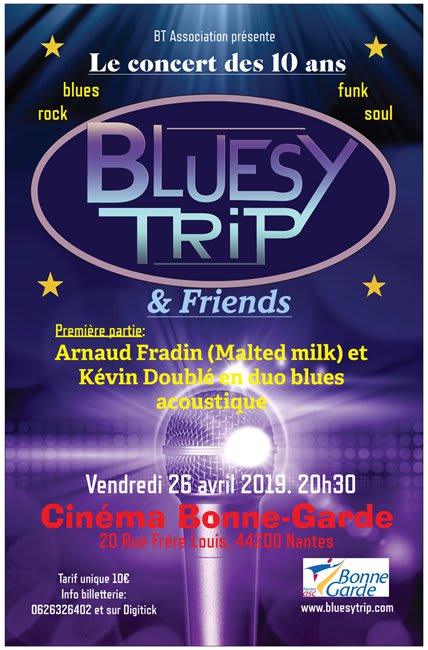 S'il y a ici des confrangins qui aiment écouter ou, comme moi, jouer de la zique, je les invite à un concert-anniversaire que mézigue et mon groupe donneront le 26 avril à Nantes. Blues-rock, funky et soul avec Bluesy-Trip & Friends ( choristes, percus, harmo, section de cuivres) dans un cinéma très confortable, pour une participation ridicule de 10€ voire 8 en passant par Digitick. Et en première partie, duo blues acoustique de grande classe avec Arnaud Fradin (leader et fondateur de Malted Milk) et Kévin Doublé.