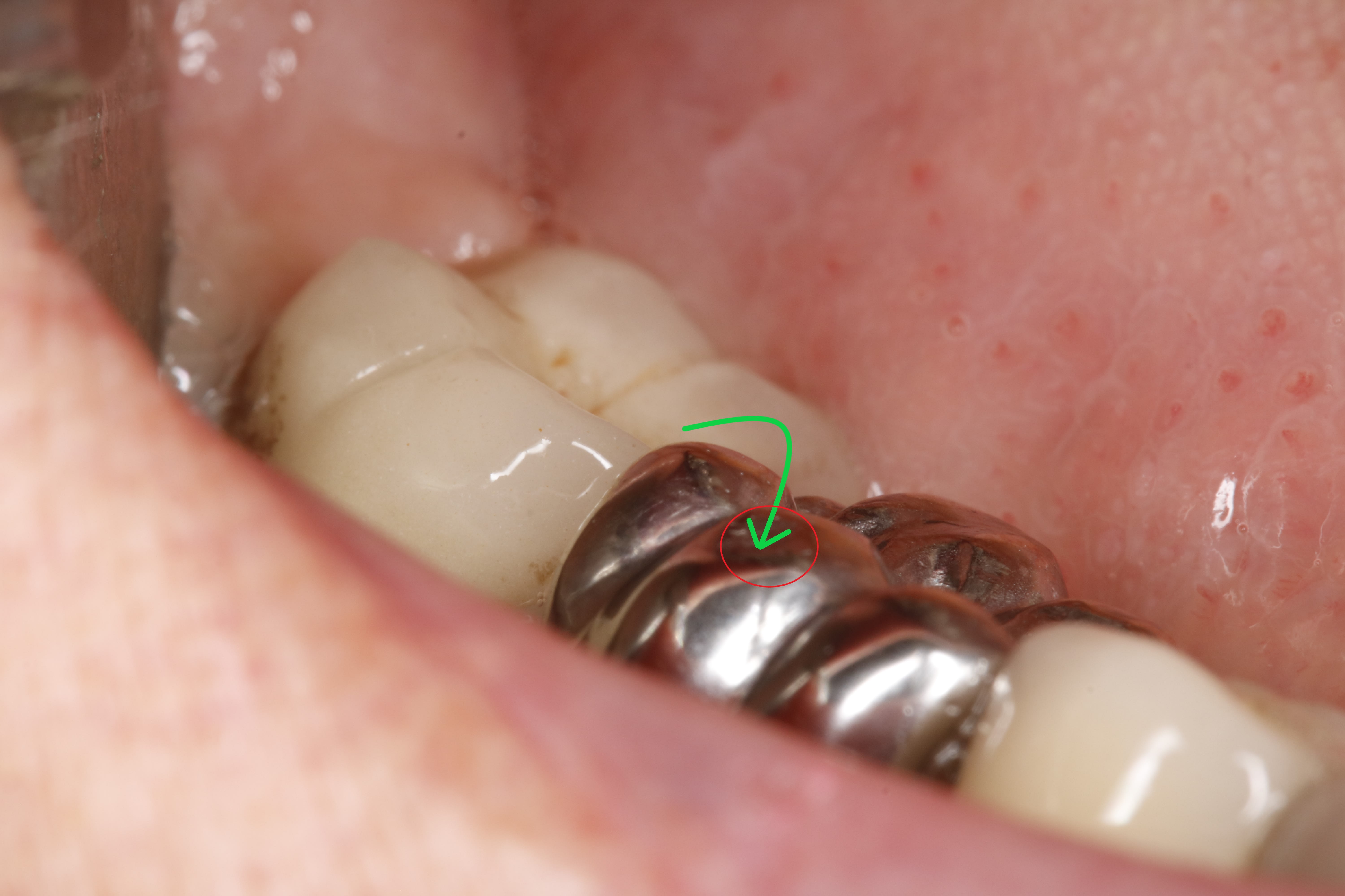 Tiens un truc fréquent, tu as la 7 sup qui est pointue+++ et qui a mangé la table occlusale de la 7 inf et a egresse, souvent sur l'antagoniste il y avait un composite qui a été mangé.