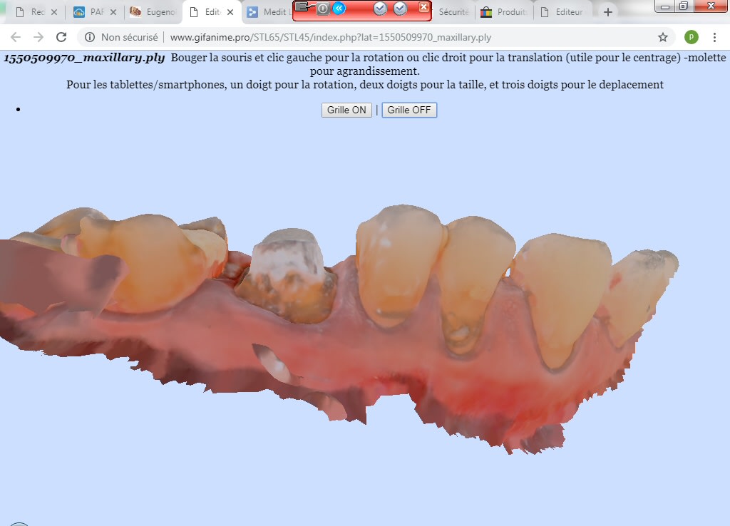 Image extraite de ton fichier3D, couleurs magnifiques. Medit doit faire des reglages soft couleurs ply (voir images d'hokusai, precise mais moche) . Sinon, cette camera, c'est de la balle! Et rassurez vous, si le logiciel medit donne des images un peu moches, le prothsiste avec ses logiciels aura de belles images 3D, et tres précises, c'est ca qui compte!!!!!