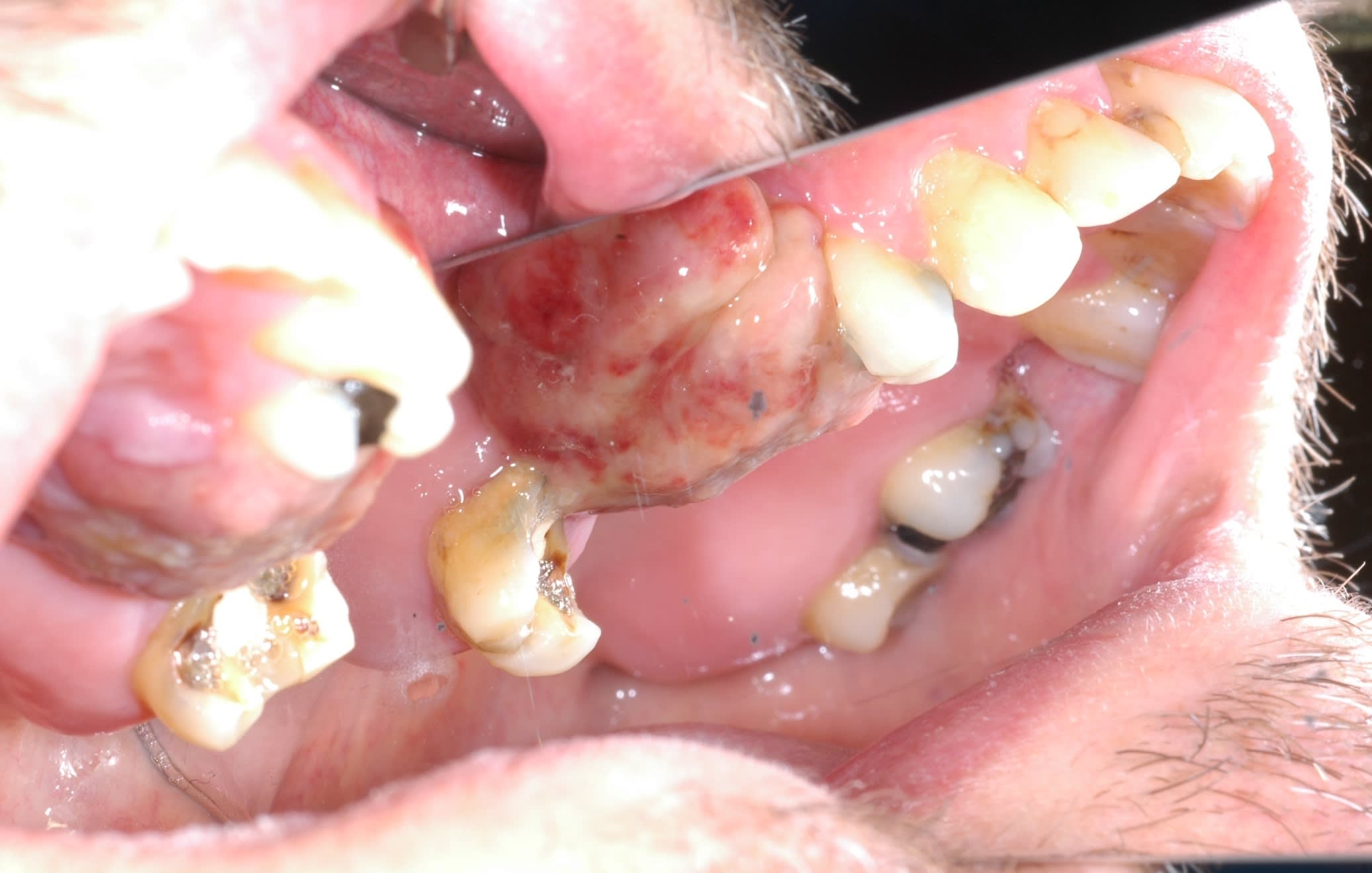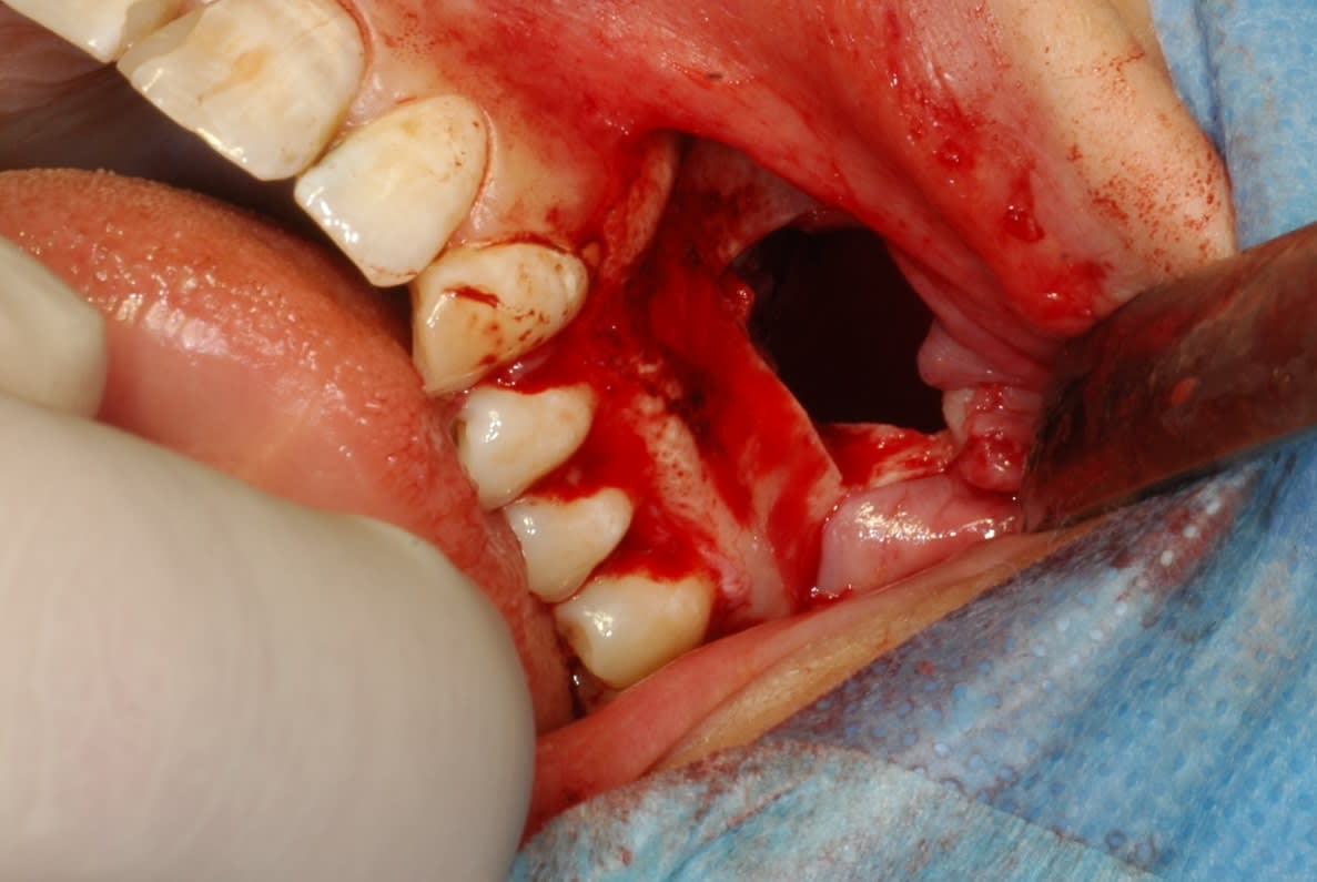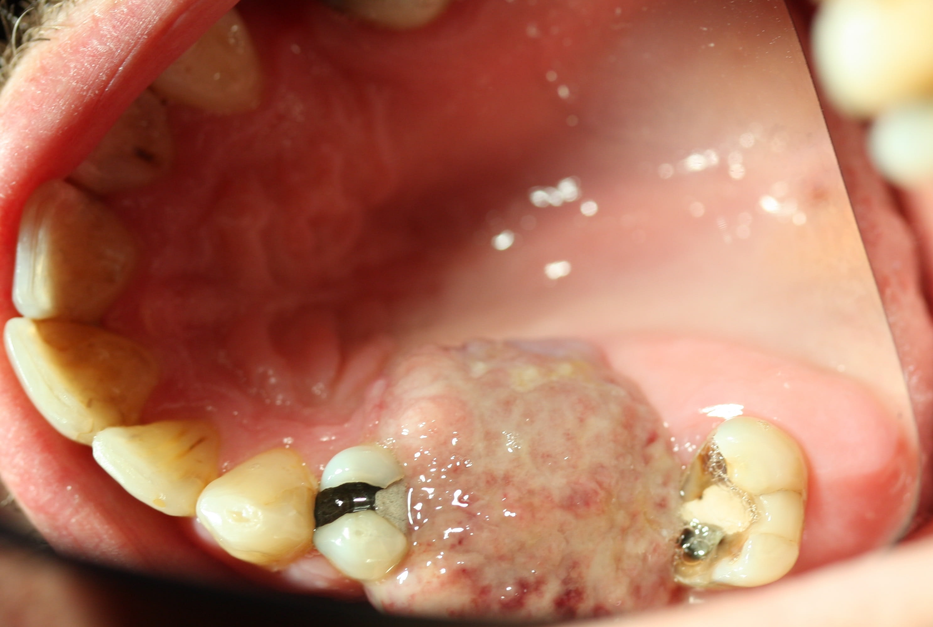 Une idee de diagnostic? Evolution depuis 3 mois, facilement mobilisable, saignement a palpation, qui a envahit le sinus.